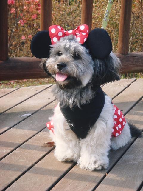 紅葉は居ないが?紅葉の前で~♪ 昨日は丁度、COCOCA家のチィ~ちゃんが1歳の誕生日である。(おめでとぉ~~お!)我が家もそうだが、ちっちゃなワンには何故か?洋服を着せたがるのは何故だろう・・・・・・・・・・・・・・・・・・・・・・? 今日のチィ~ちゃんはミニーちゃんの洋服~♪