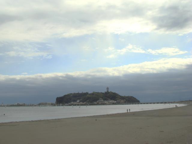 午後、海岸にでると今日の空も落ち着かない雲と太陽の光のコントラストが少し不気味な雰囲気で江ノ島の上に天井が出来た様に覆いかぶさっている。北東の風が強い今日~喜んでいるのはWサーファーだけ・・・・