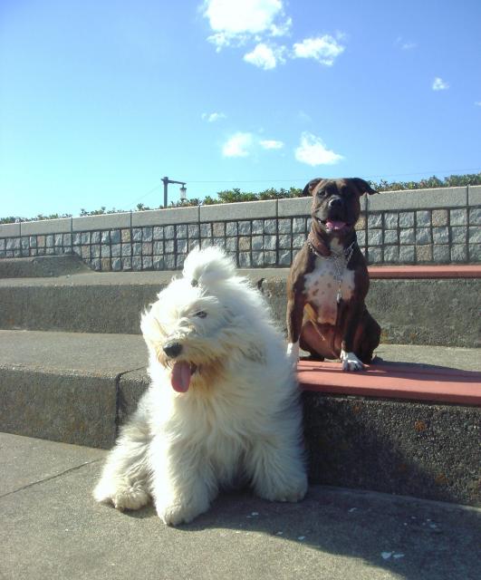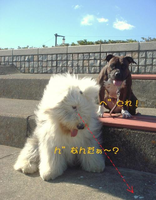 ・・・・・・と言う訳と最作たちがシャンプーで居ない事もあって、一昨日の昼過ぎ若いのにストレスの発散場所の無い夢眠だけを連れ海岸に・・・ 西浜を少し歩き東浜に戻るとお友達のティアラちゃん(アメリカン・ピット・ブル)に遭遇しストレス発散を~♪