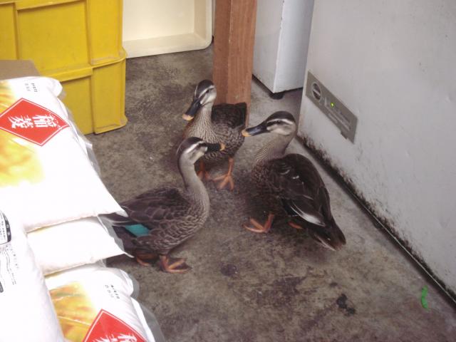 しかしタイミングよく惣菜部の倉庫の扉が開いており、近づくとカルガモ君たちは自ら倉庫の中に~