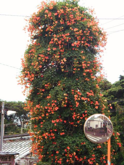 このお花は 「ノウゼンカズラ」だと思います。真夏の花ですが勢い良く咲いていますね。