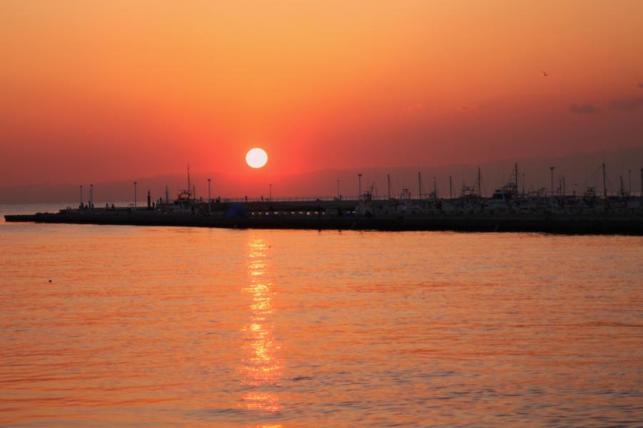 夕方の散歩も穏やかな日差しでまったりとした中、西浜まで歩き、少し時間が遅れたせいもあってか、雲ひとつない真っ赤な綺麗な夕陽で、