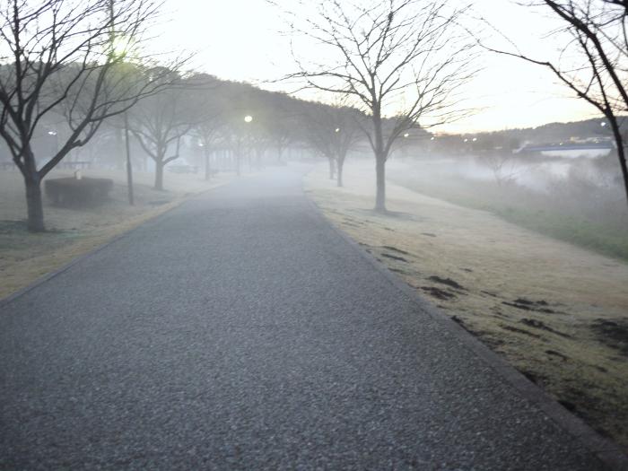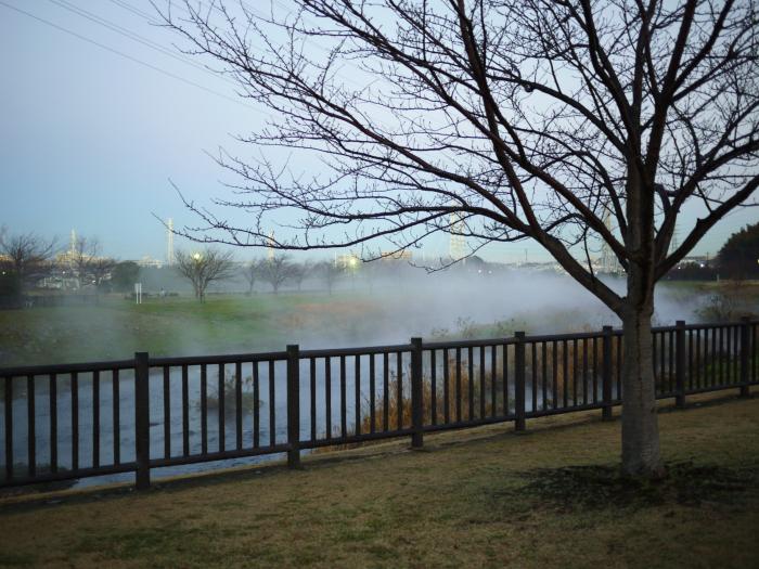 今朝も少し遅れた時間に親水公園に行ったら、歩き始めは少ししか出て無かった川霧が暫くしてから急に大量に発生! 霧の山中を歩いているかのように10m先までぼんやりし30m先は真っ白で見えない位の凄い霧で・・・