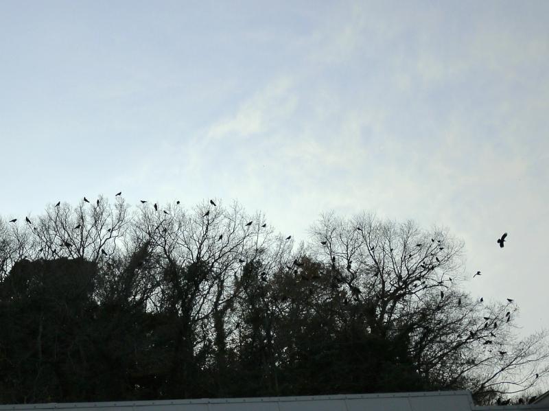 強風から避難か?カラスの集団!