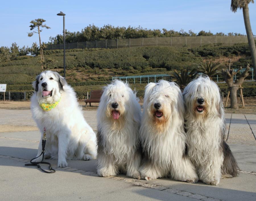 暫く見ない間にすっかり大人のピレに変身!~一回りも二回りも大きくなって、凄く立派になっていた・・・ この写真だと我が家の3ワンより少し後ろに座っているので、あまり大きく感じられないが……