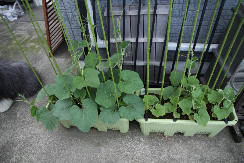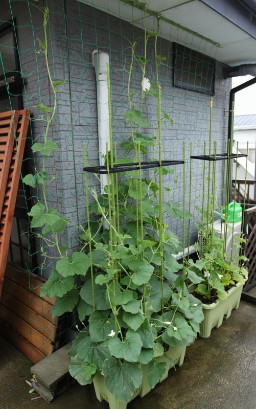 軒の直ぐ下まで伸び、下の方ではもう花も咲きました~♪ 相変わらず右側のプランターのひょうたんはわざわざ場所も交換してあげたのに…何故か発育不足です~(笑)