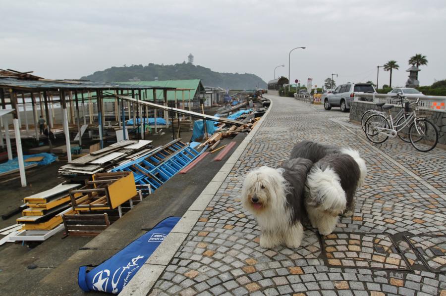 今日の湘南は滝のような雨が朝から続きやっと2時過ぎに止んだけど、まだ道路はびっしょりで…散歩に出せたのは4時チョット前・・・ 海岸では雨が上がるを待ちわびた海の家の工事が~