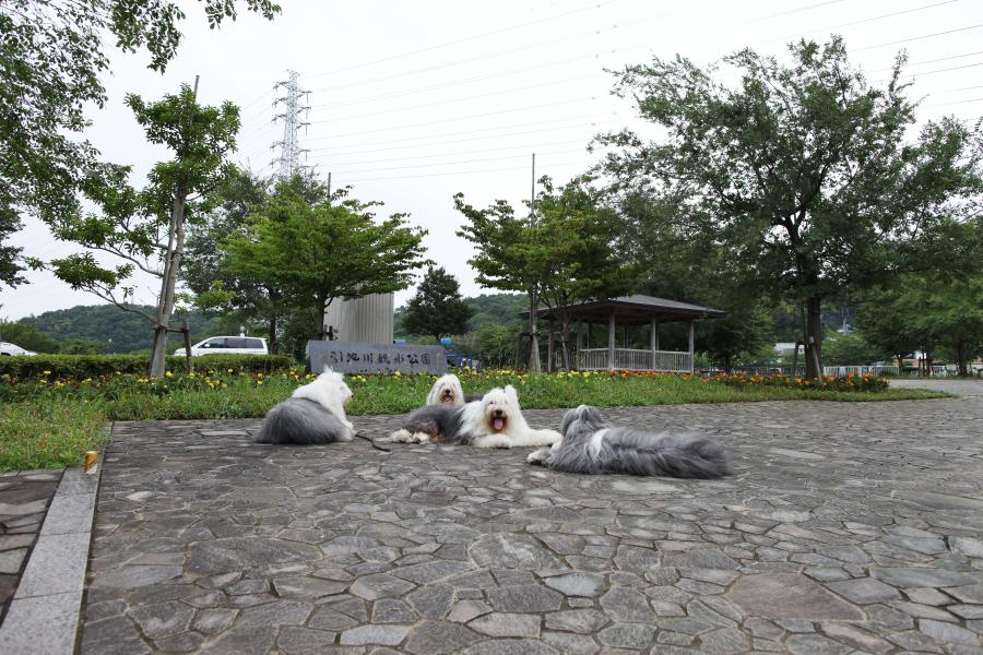 4ワン揃って綺麗なうちの写真をと思っていたのに、今朝は多分”今まで一番”暑かった朝で…親水公園に着いた時にはもうワン達の口元はよだれでびっしょりと濡れ昨日シャンプーだった最作を筆頭に、とても洗いたてには見えない・・・(笑)![]()