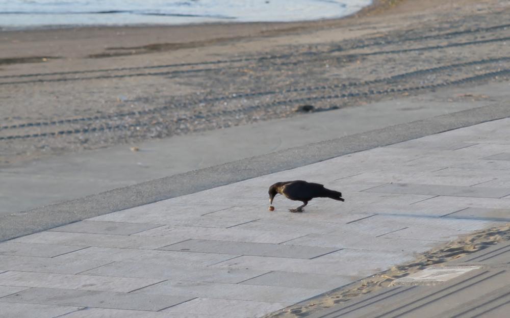 何故!と思いながら近づくとカラスがサッと舞い降り、くわえて空に~ あれ”!……っと思っていると、上空からコンクリートの上にクルミを落とし・・・どうやら自分で割れない硬いクルミを割ろうとしている様です・・・カラス君って頭”良いねぇ~(凄)