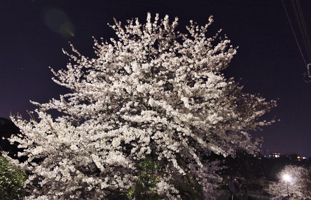 自宅前の夜桜~真っ暗な中、薄明るい外灯のもと~F値1,2のレンズの威力です。~(凄)