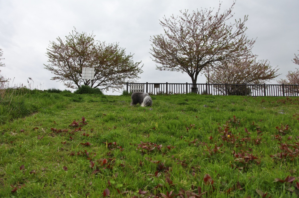 まだ頑張ってる親水公園のソメイヨシノ…でもだいぶ落ちた花のヘタがもうワンの足に否が応でも付きはじめ・・・又暫くは此のヘタ(茎?)に悩まされる嫌~な”時期に突入です~(汗)