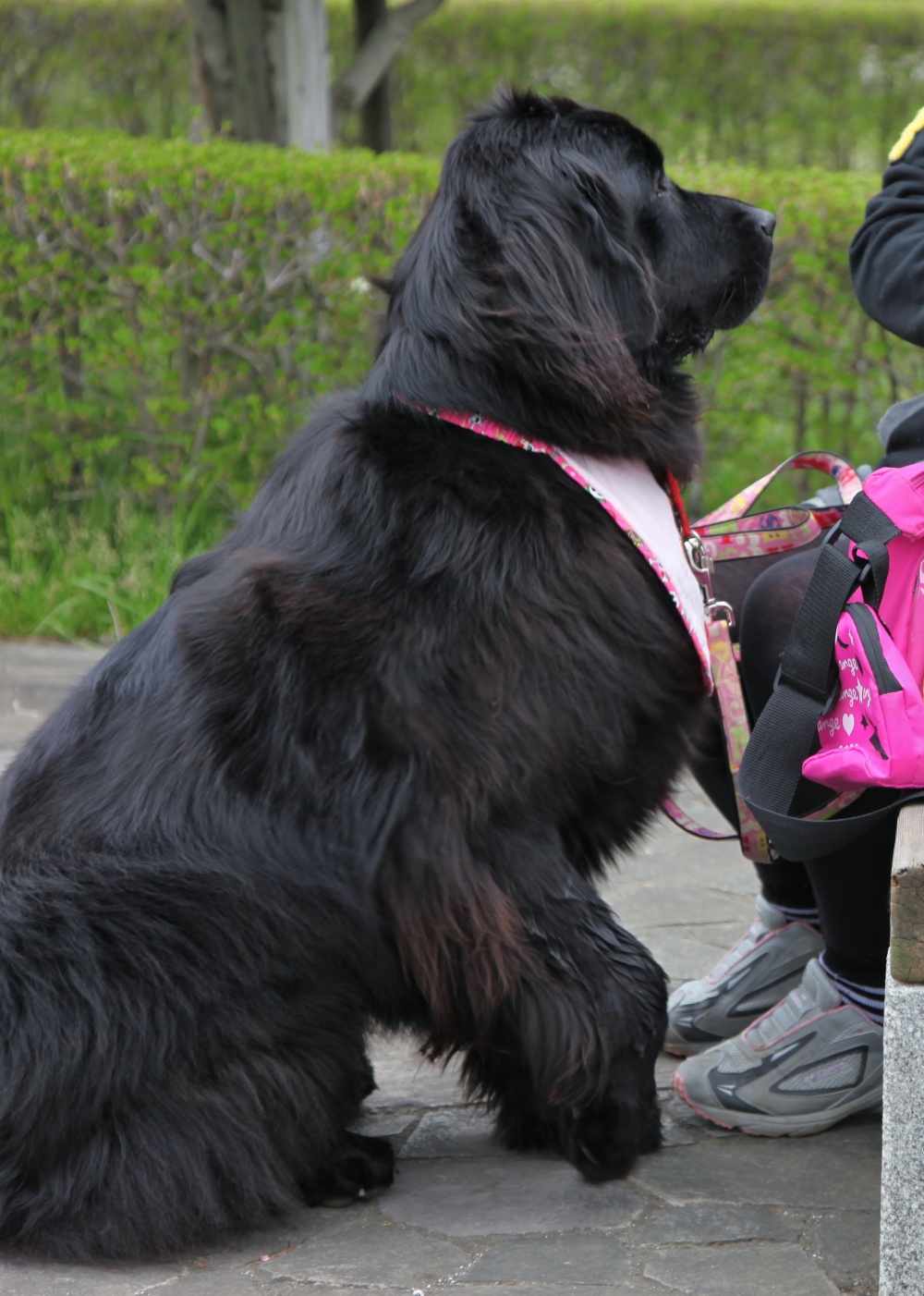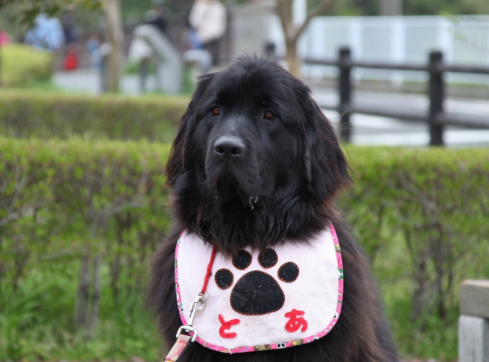 歩くのが遅い実留紅に付き合って公園をダラダラと散歩し、車の戻って足に付いたヘタをスリッカーで取っていると・・・以前お友達になった~ニューファンドランドのトアちゃん(♀2歳)が現れました~♪