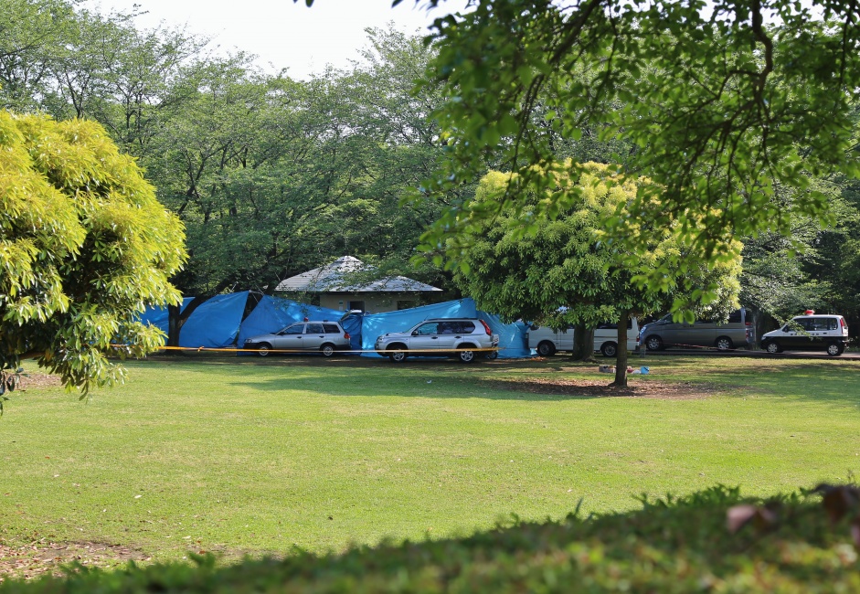 なにか事件かな?っと!思いながら、公園の上まで上ると、登りきった直ぐにある公衆トイレの付近が警察車両とブルーシートに覆われ物々しい雰囲気です・・・・?