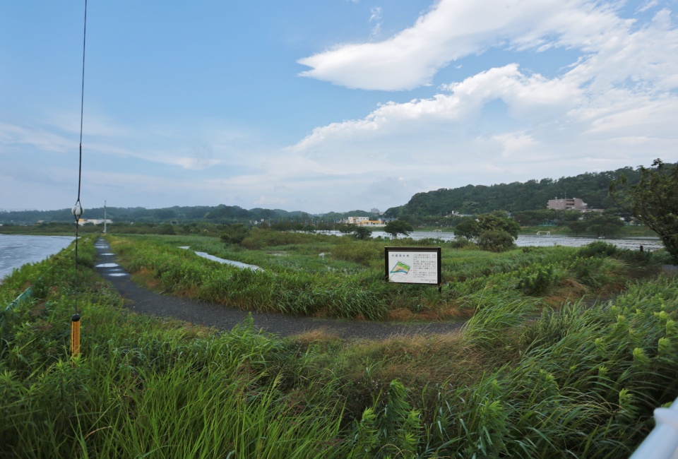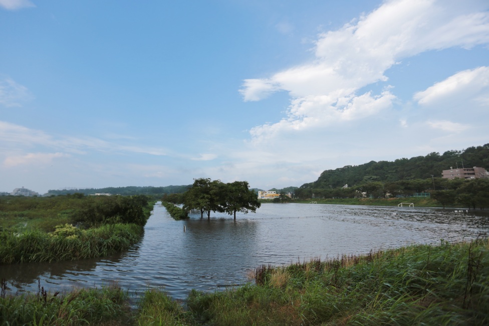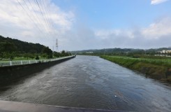 引地川の水位は上がり、中州や周りの草もすべて水の下!・・・(流されちゃったかな?)