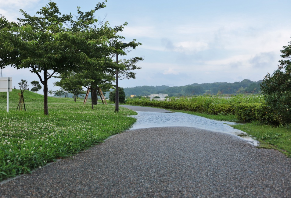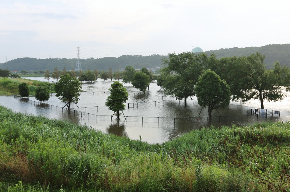 案の定”あの凄い今朝方の豪雨で、普段サッカー場や広場になっている遊水地に水が引かれ湖のようになっていました・・・これでこの遊水地が湖になるのを見るのは我が家が引っ越してきてから・・・4回目かなぁ~?    本当に良いタイミングで歩かせることが出来ましたが、途中は水捌けのよい遊歩道も一部”川の様です!