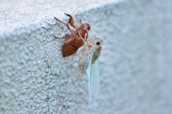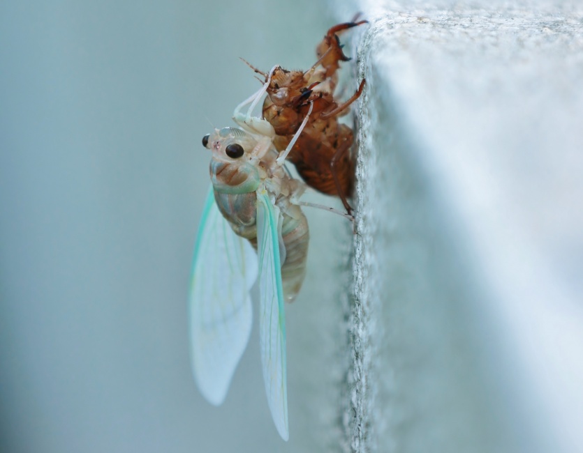 日曜の朝(6時頃!)駐車場の我が家の車の後ろで・・・蝉君が頑張って脱皮していました~♪   幻想的な透明な体がまだ色も白く、羽根は淡いブルーに輝き………自然の美しさを垣間見た嬉しい時間です~♪