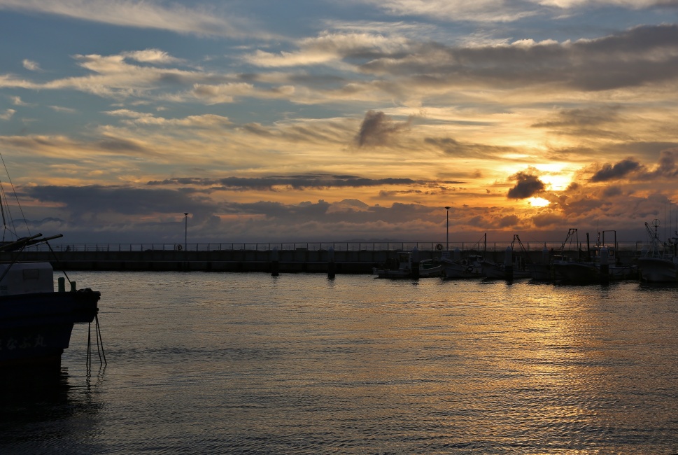 5時半過ぎの片瀬漁港も沈みかかった太陽の陽射しが強く・・段々と赤くなってくる夕陽とチョコット山頂の顔を出した富士山を眺めながらワン達もまったりです。~♪