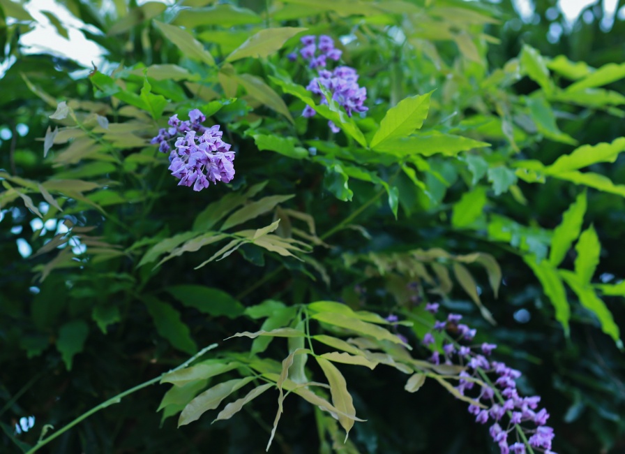 今朝も何時も通りに散歩をしていたら昨日気がつかなかった藤の木に季節はずれの狂い咲き~花が咲いていました。
