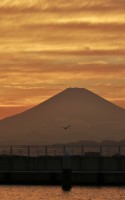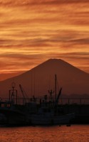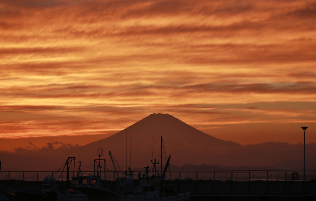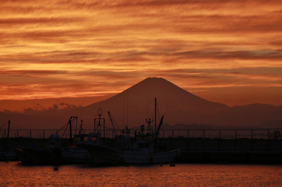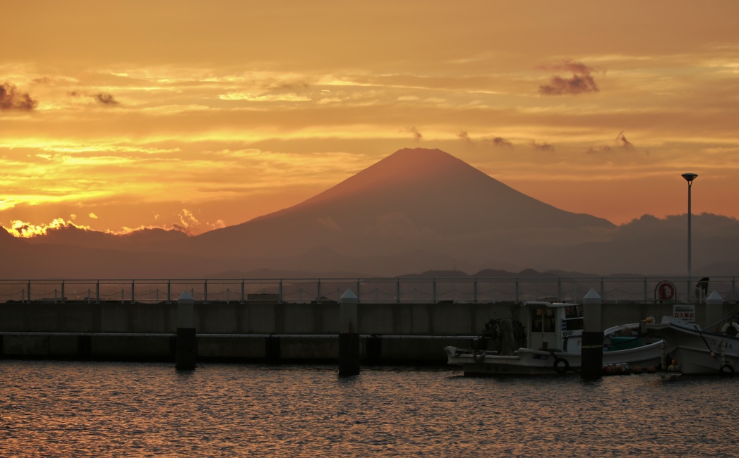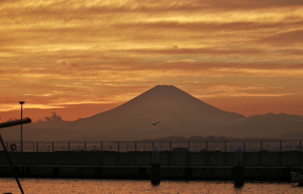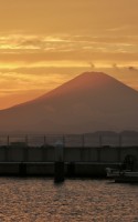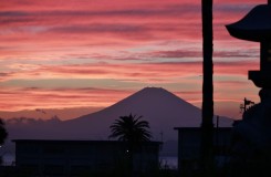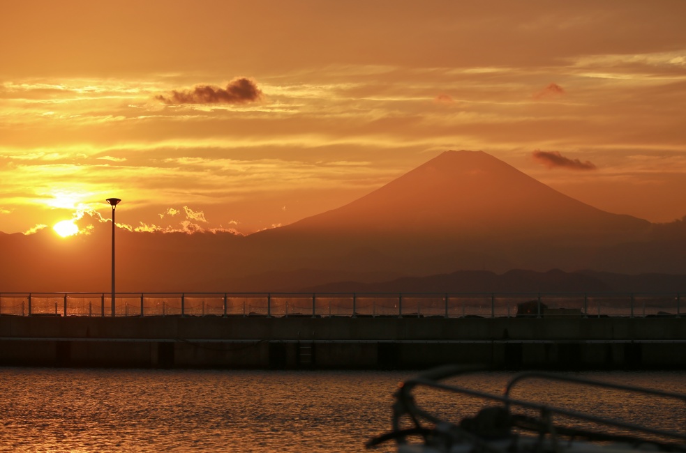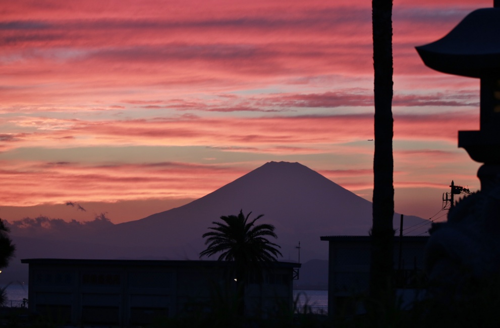 寒い位な陽気は午後も続き夕方の散歩では本当に気持ちのいい(チョット”寒いかな?)海岸を片瀬漁港まで行くと丁度~富士山の横の太陽に沈むところです~♪