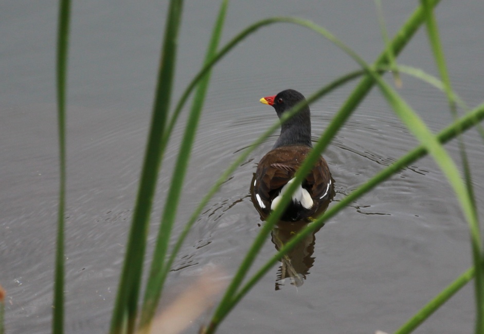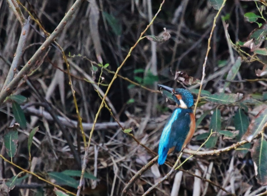 自宅の目の前の川(寸遂行園に続いている~)をカワセミ君でも現れないかと少し見ていると端に溜まった土から生えた葦の間にカラフルな鳥が見え、急いで自宅にカメラを取りに行き、葦や蒲の穂の間に時々見える鳥~?