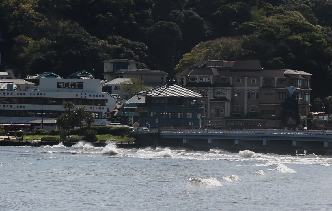 海の水位も高く江ノ島の端の袂で橋の下をくぐってきた西浜からの波と東浜の波がぶつかり合ってチョット”面白い光景です。