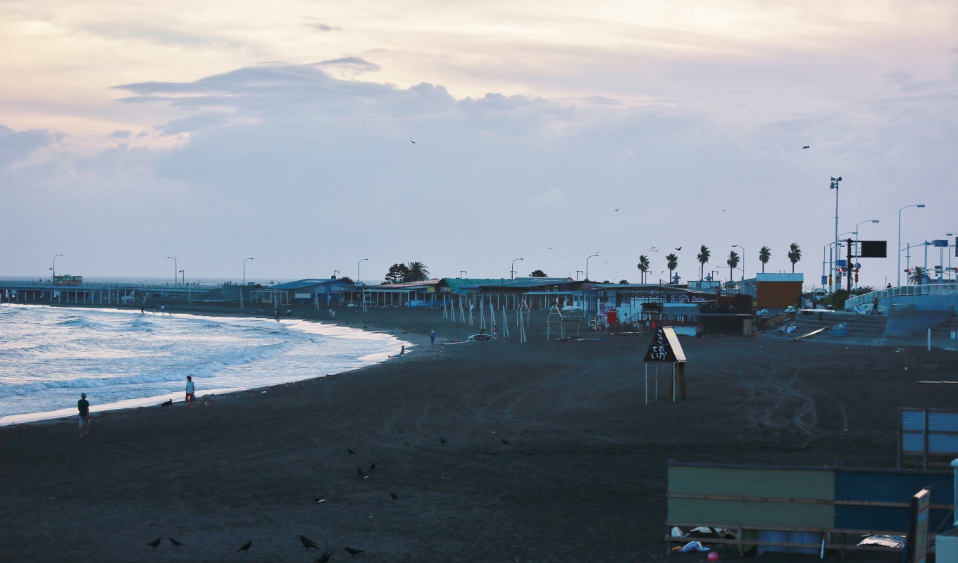 夏の終わりをつげる~海岸の海の家のかたずけも始まり、閑散とした6時過ぎの江ノ島東浜海岸の夕暮れです・・・。