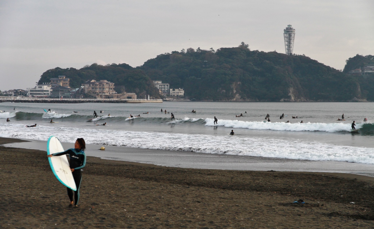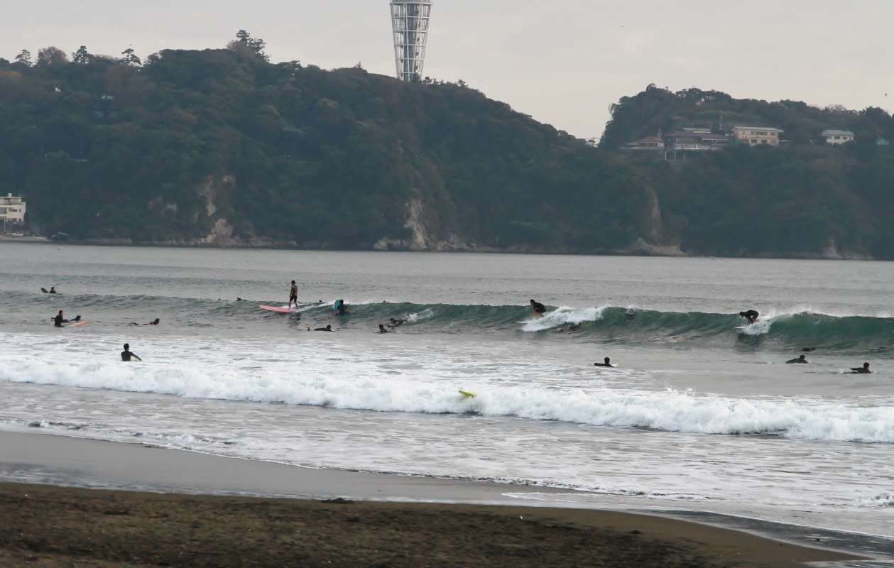 夕方の湘南海岸は風もなく台風のうねりが残り、セットで胸までの波が綺麗に入りサーファー達の天国です。