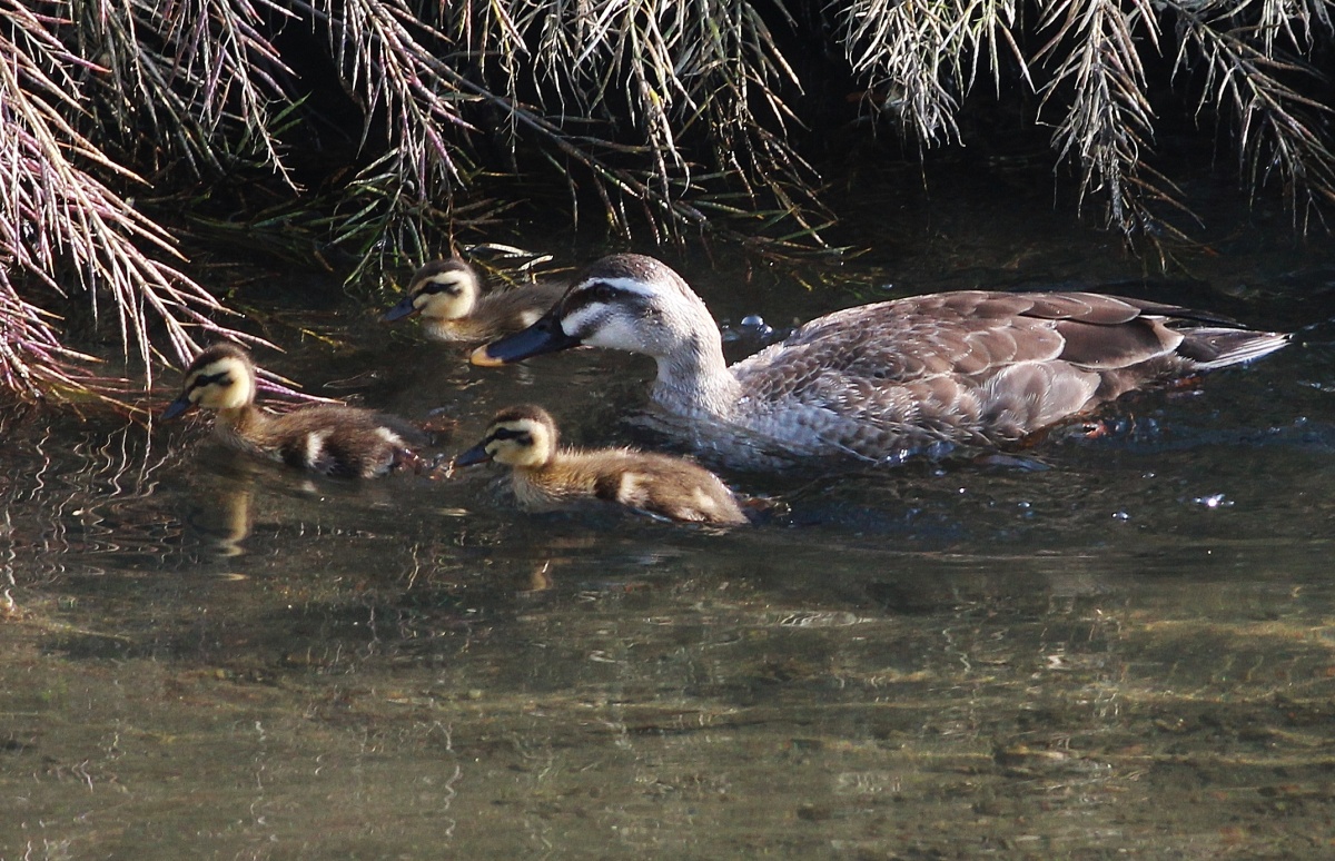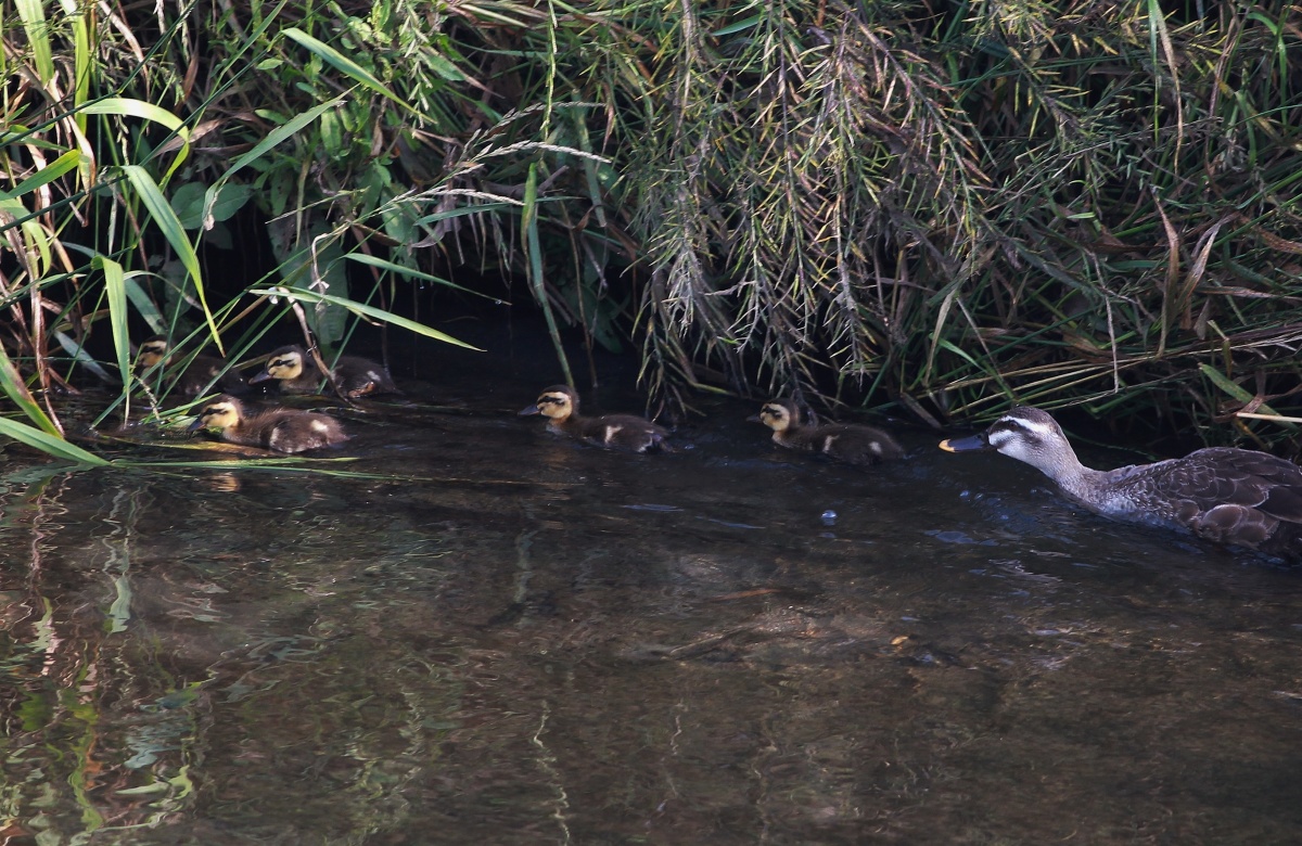 親が回りを伺いながら、対岸の雑草や木々の下を隠れながら元気に泳ぎ回っています~♪