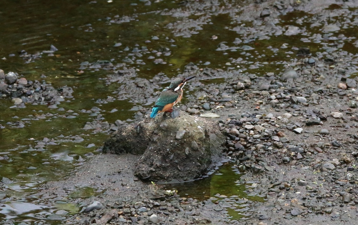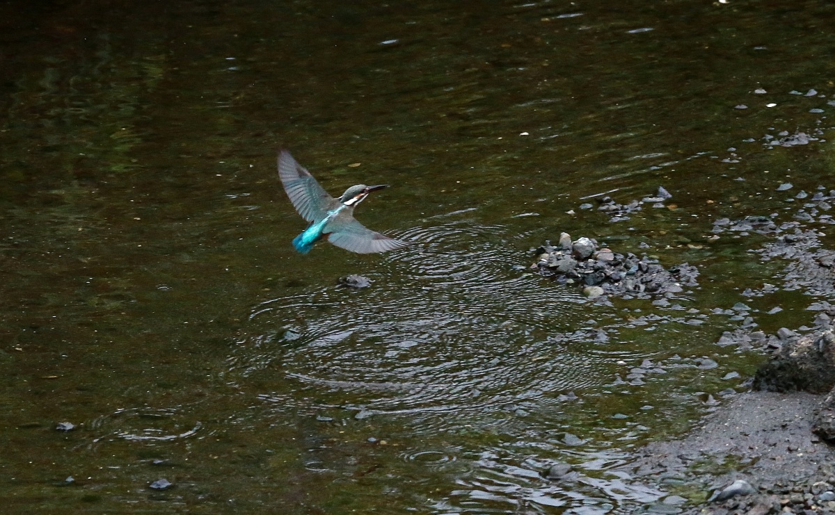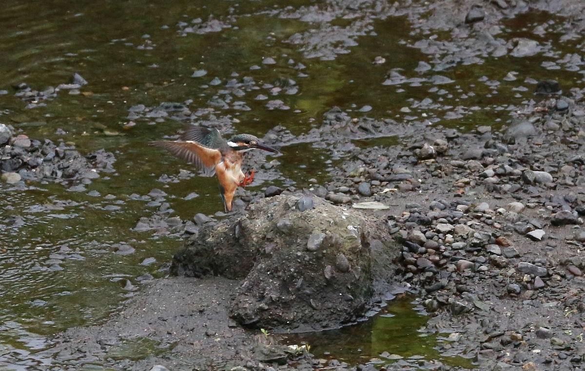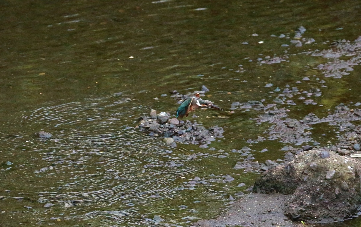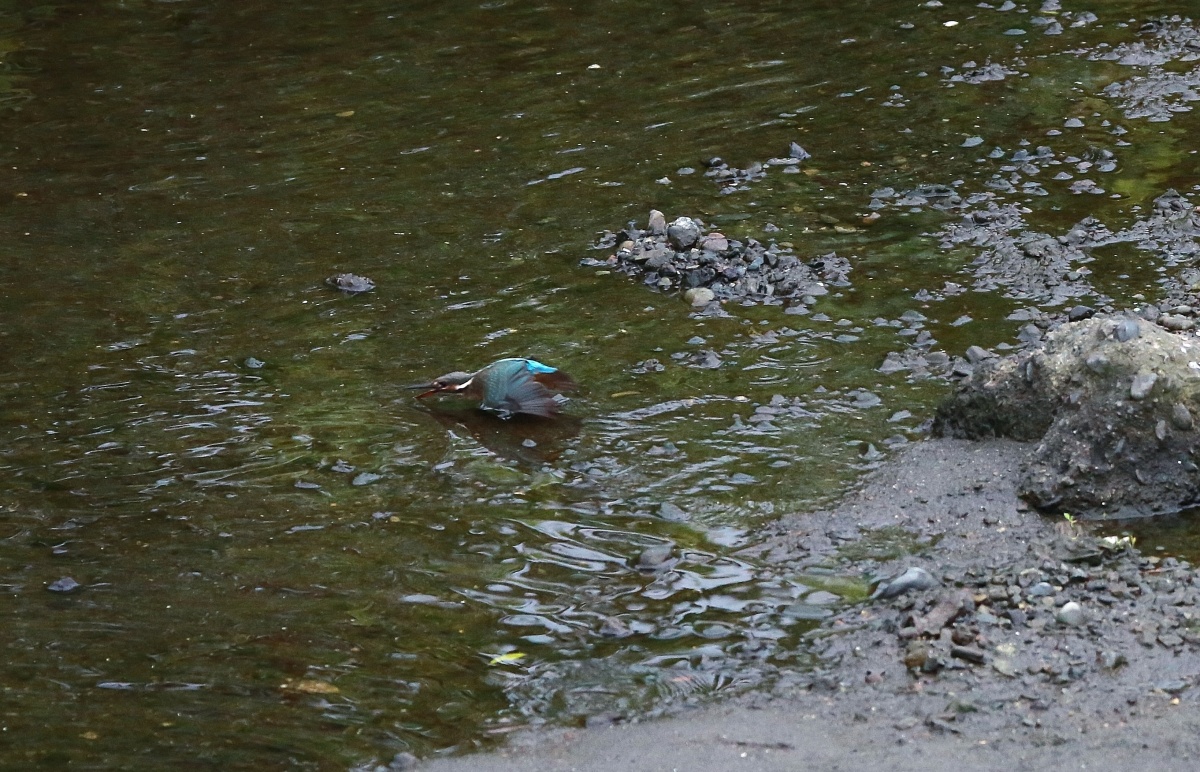 水量の少ない川の真ん中に現れた石の上では若い翡翠♀が浅い所で飛び込みの練習でしょうか?