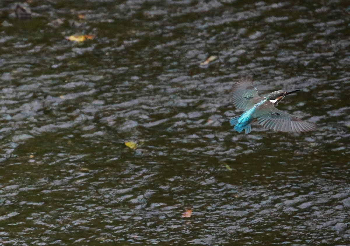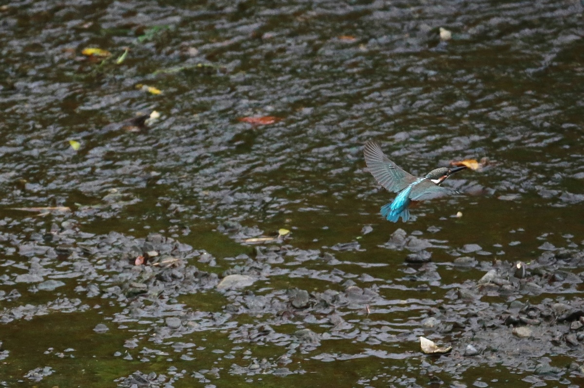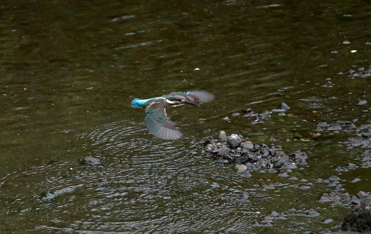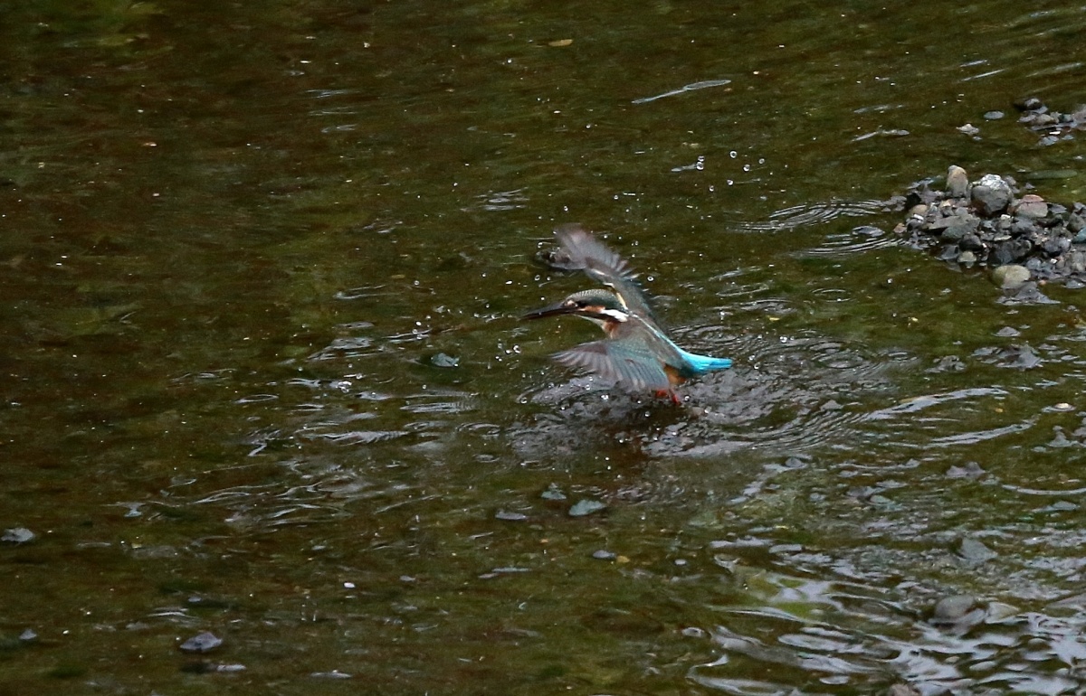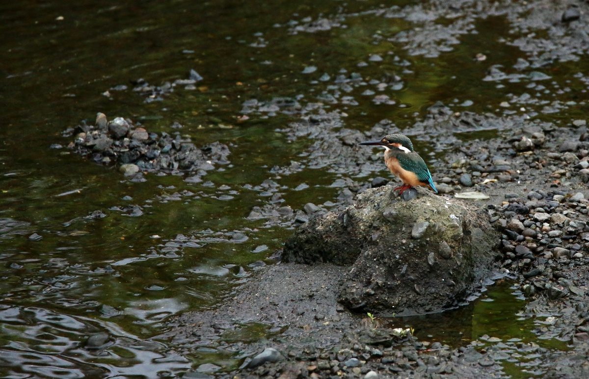 水量の少ない川の真ん中に現れた石の上では若い翡翠♀が浅い所で飛び込みの練習でしょうか?