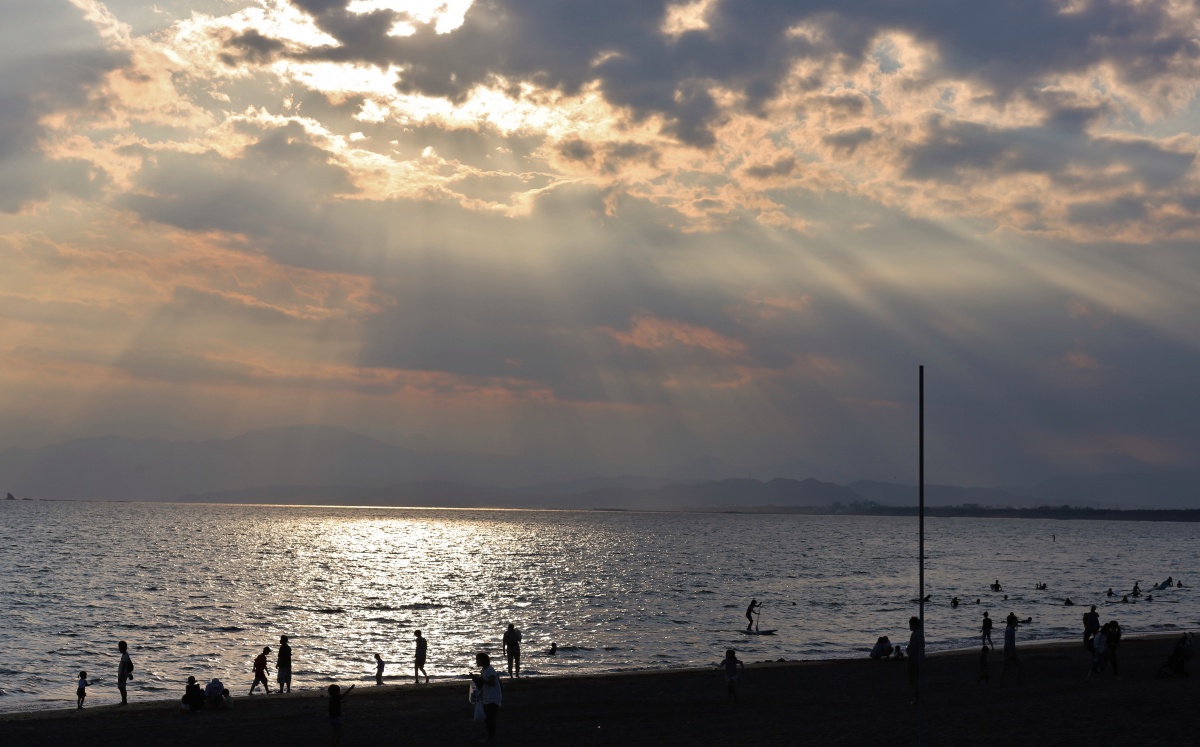 厚い雲に覆われて暗い海岸でも連休だと人出はかなりの湘南海岸で、道路は混んじゃうし海岸の人も5時過ぎても~天気の良い夏場のような人出です。