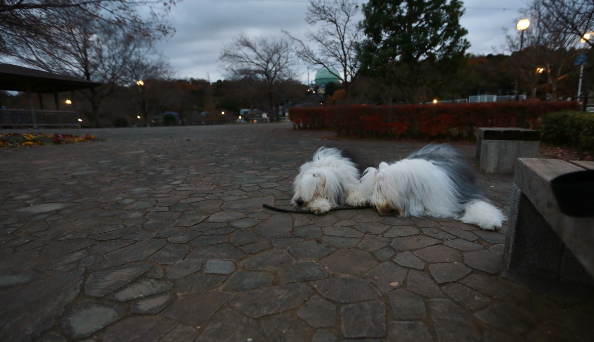 片手ずつポケットやリードを持つ手を替えながらポケットに忍ばせたカイロで暖をとる早朝散歩です。~(冷)