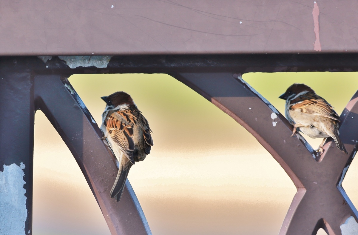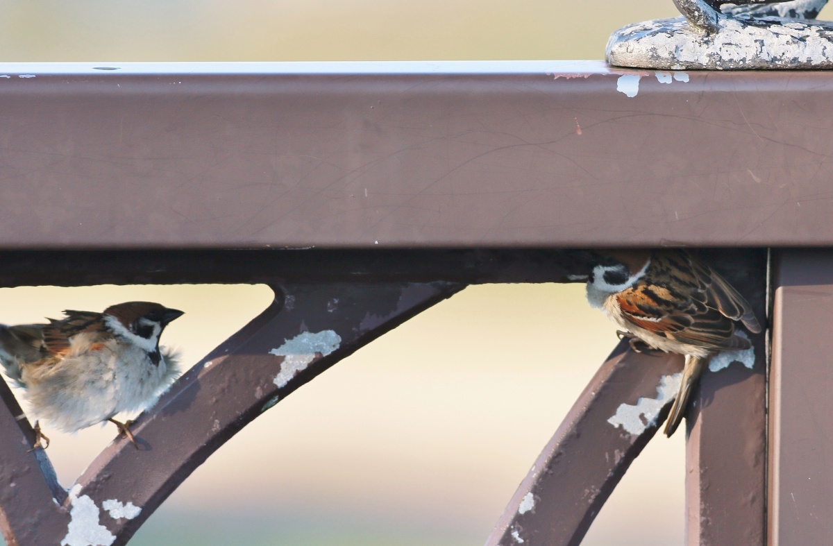 公園に掛かる橋の手すりの上のこの鉄骨の空洞の中も雀達の巣になっています~♪ 巣立ったばかりの何も解らない雛達が、車道を通る車に注意さえすれば、風雨も防げるし外敵も全く手の出せない~かなり安全で居心地の良い巣なのです!~(笑)