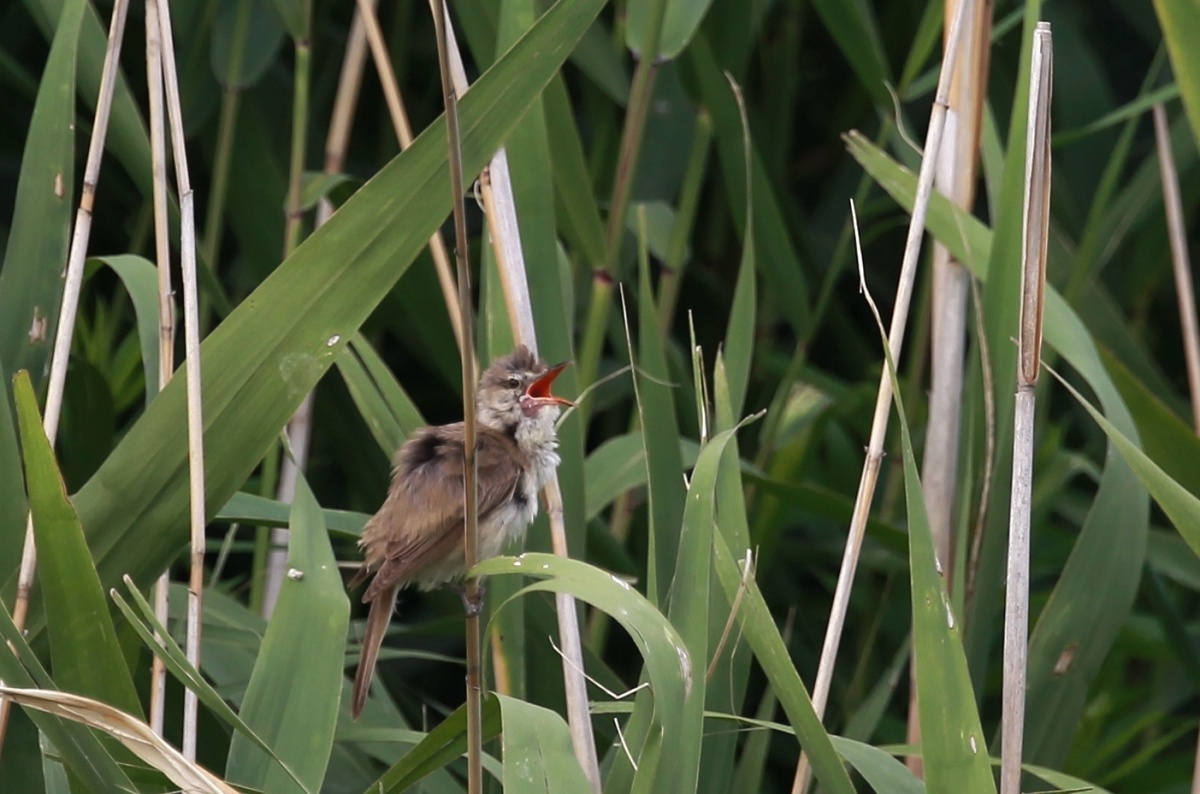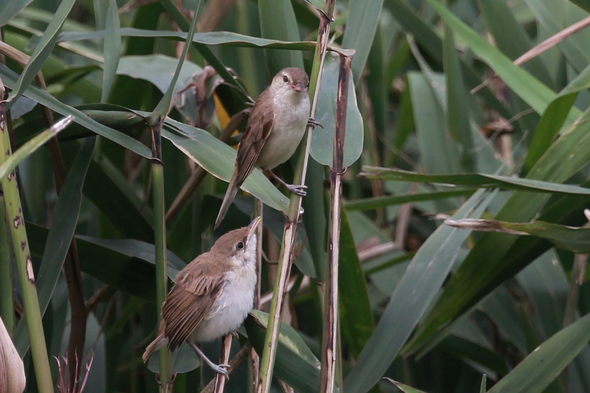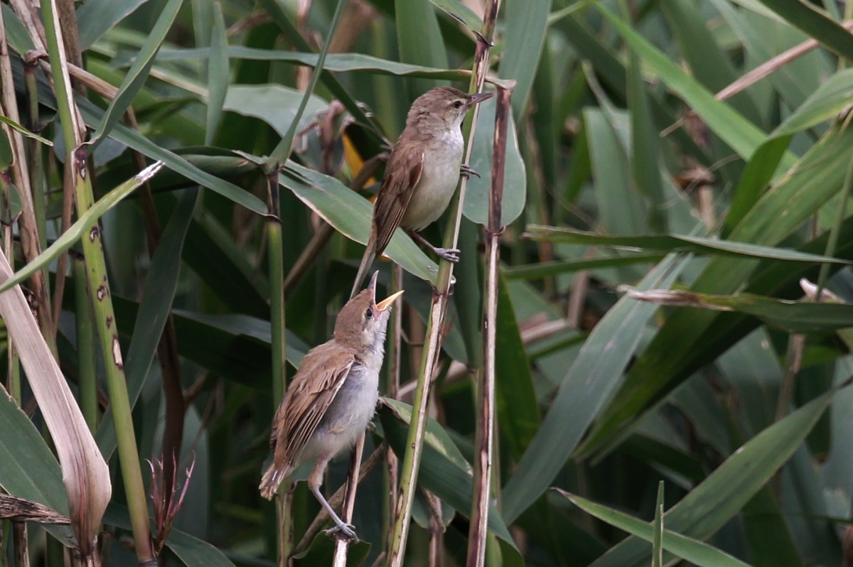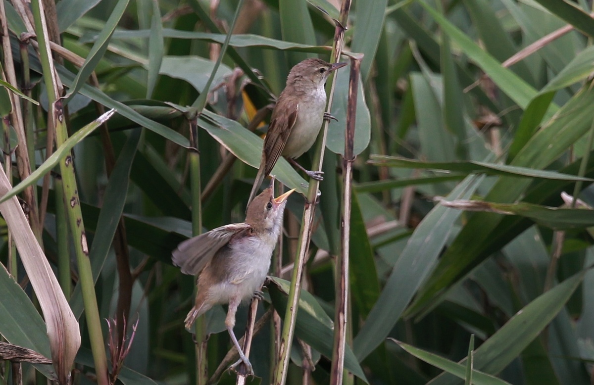 だいぶ大きくなっても、未だ餌をねだっているオオヨシキリの雛と成鳥~