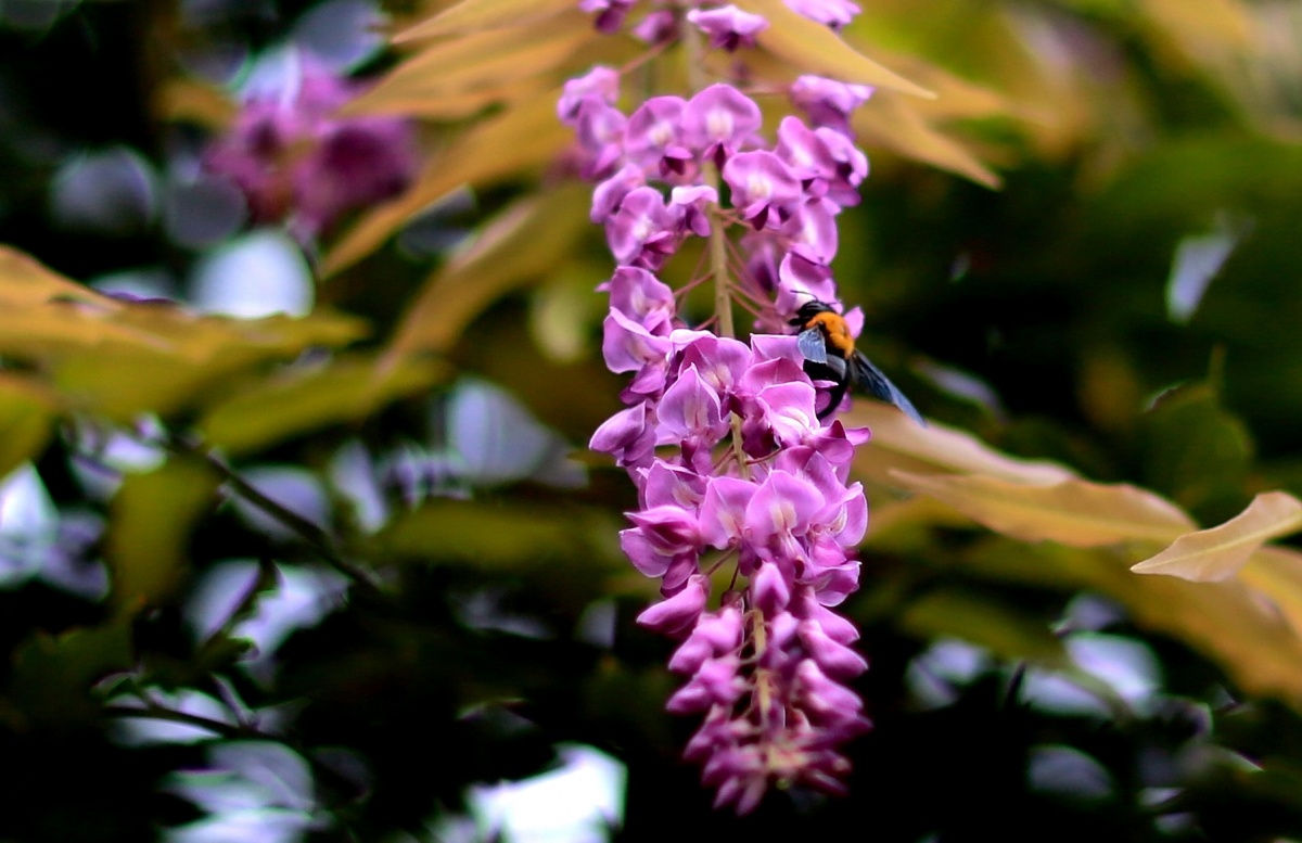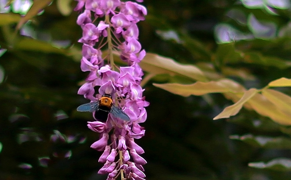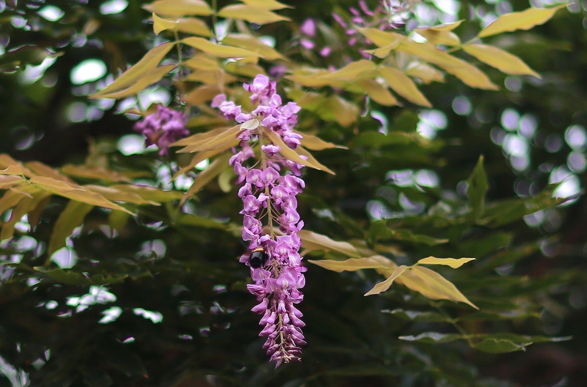 暑さで狂っちゃたのか?~(笑)公園の藤棚で季節はずれな藤も咲き!~クマバチも現れ!………桜の木の根っこからは沢山の新芽が?