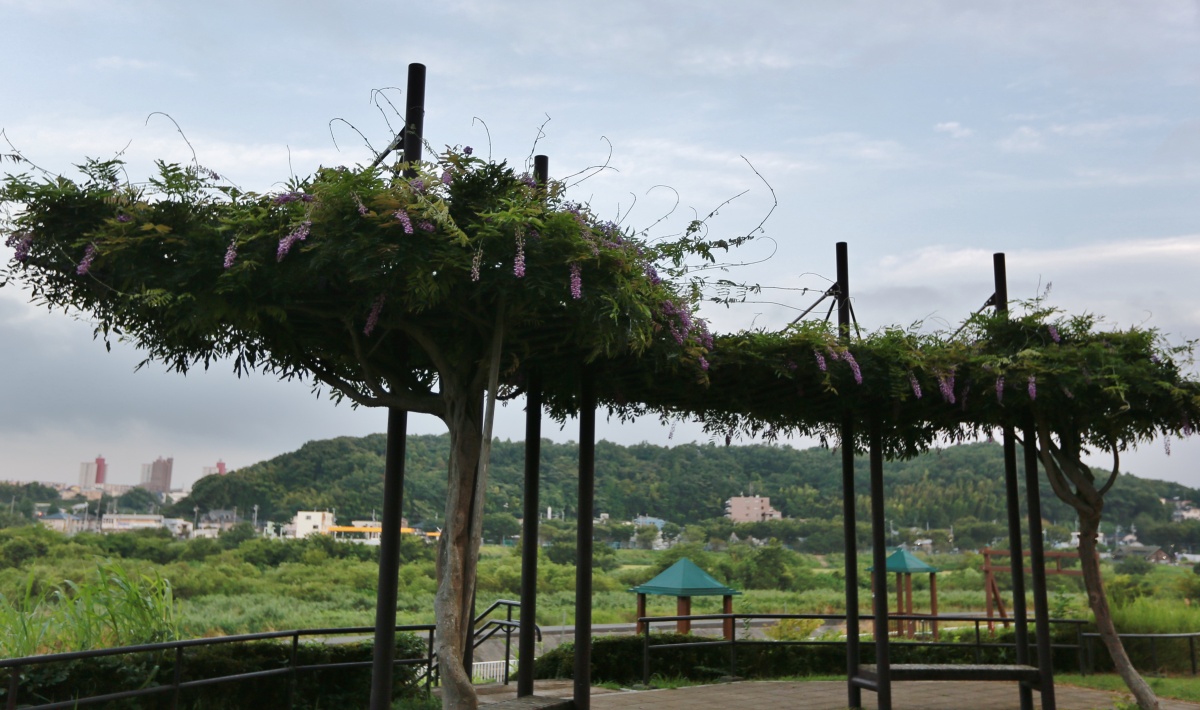 相変らず花が増えてきた狂い咲きの藤の花~~後ろの小高い山が大庭城のあった跡です。