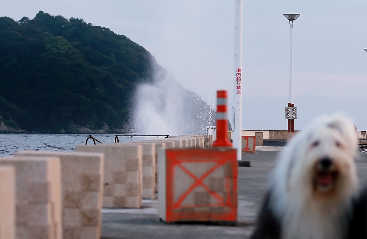 ワン達の後ろで…いなずま台風の影響の波で、防波堤の隙間から吹き出る海水!まるで間欠泉の様です!~(凄)7L2A69487L2A69657L2A69627L2A69677L2A6959