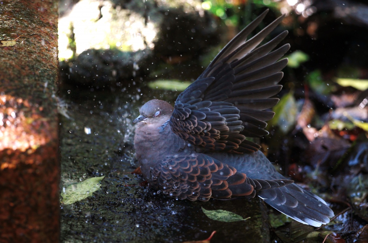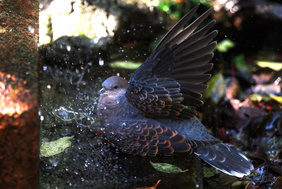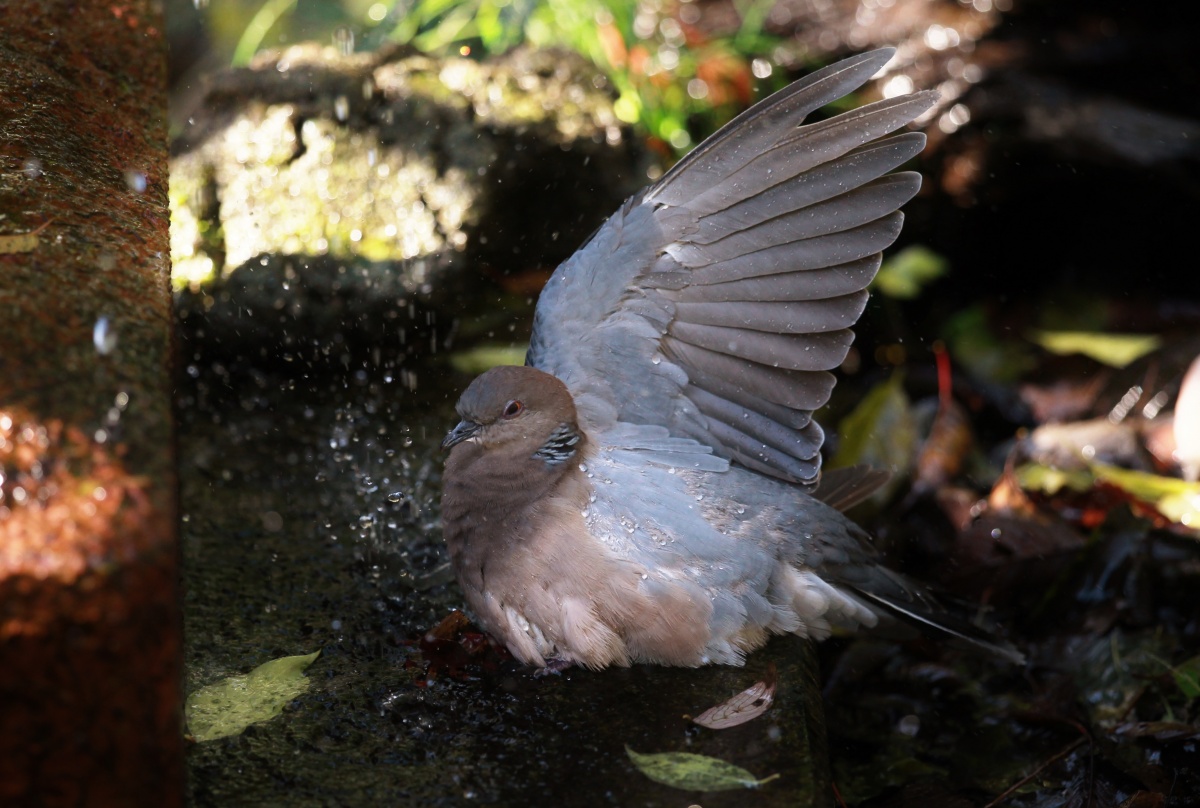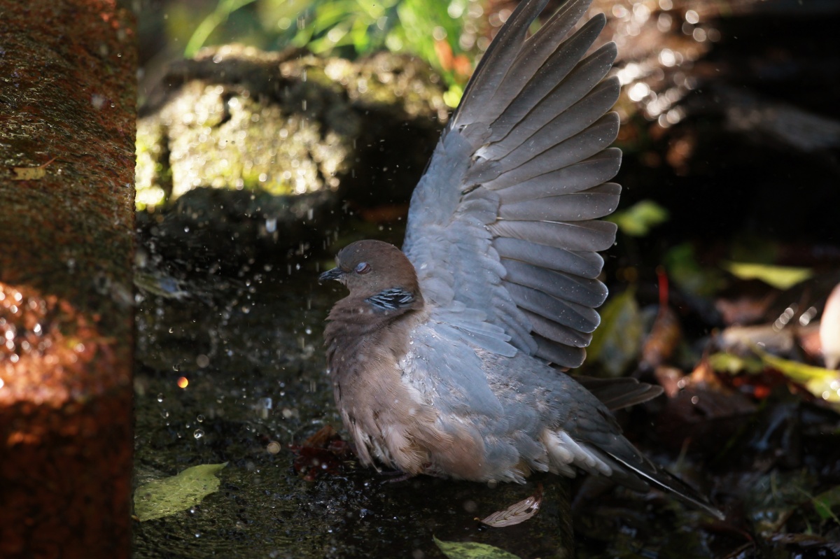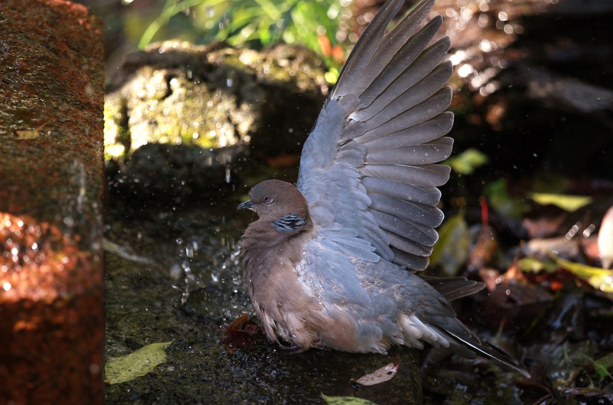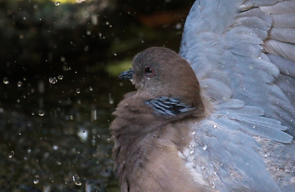 どうやら両方の脇の下が痒いらしく(爆)……目に入る水を我慢しながらシャワーで洗っているキジバト君~(笑)