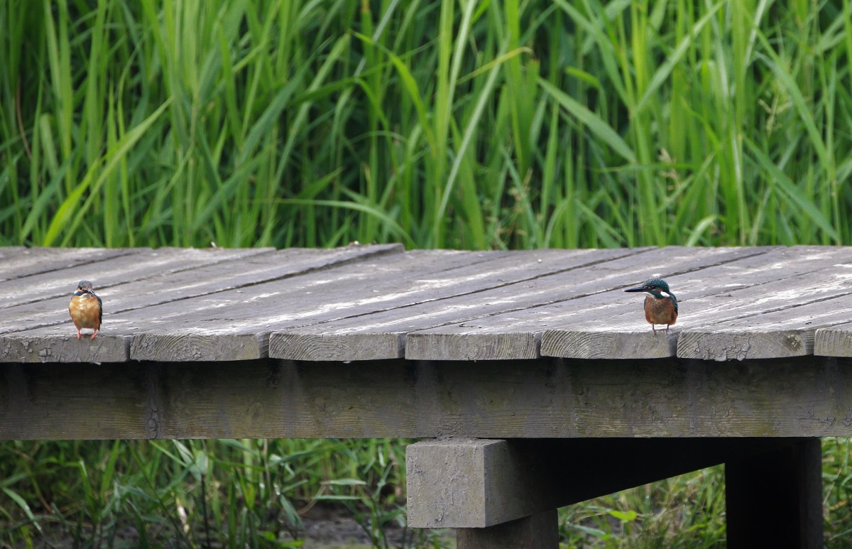 珍しく2羽のチビ翡翠とお母さん翡翠が一瞬バトルを~! 1羽のチビ翡翠が池に残り、制限時間一杯~十分楽しませてくれました~♪