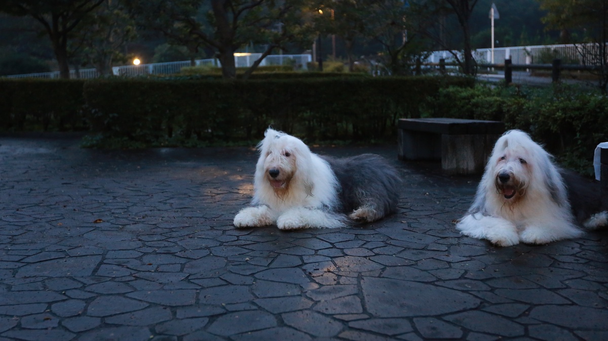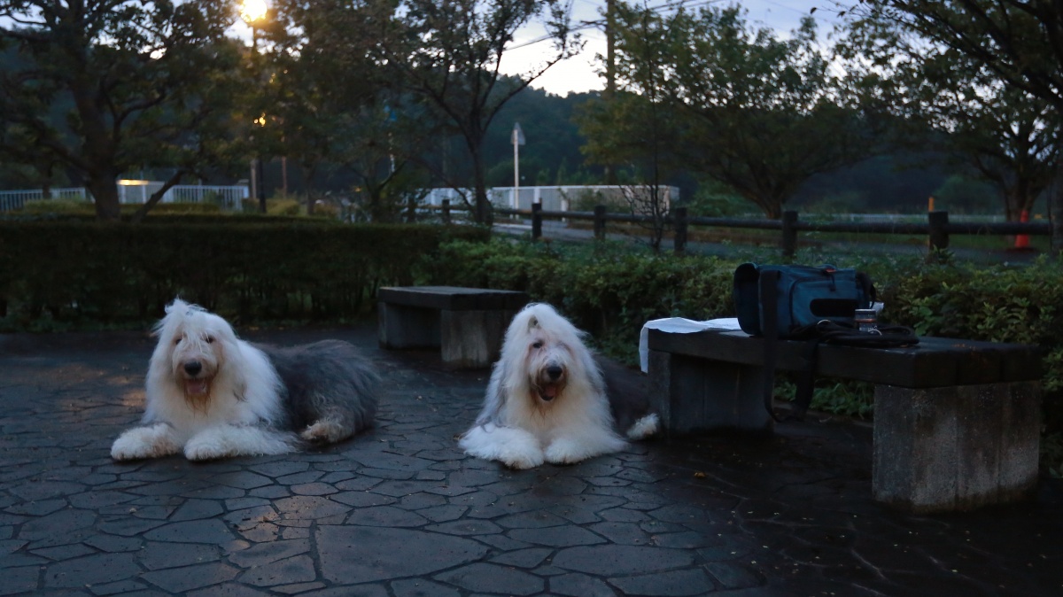 早朝は少し暗めの朝でしたが久し振りに青空を見た感じです……。 相変わらず暗いワン達の散歩時は最初からノーリード出歩かせていましたが、夢眠がやけに濡れた雑草の方にフラフラと歩き周り