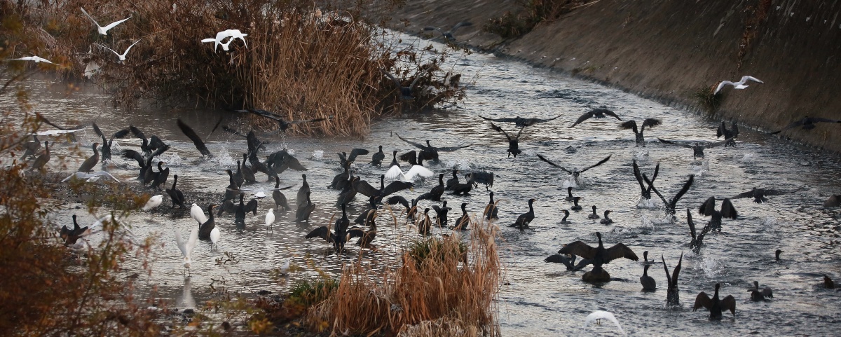 今朝も寒かった早朝ですが、久し振りに翡翠をと…池に行ったら凍っていました!~やっぱり翡翠は現われずに、また公園の川には川鵜と白鷺の大群が……