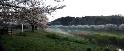 今朝は親水公園で5時前から歩きだし、暖かい早朝なのに川には霧も出て公園の木のベンチも湿って、結構”湿度も高そうでした~。