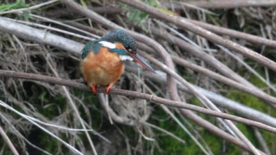 先日のモズの雛を撮っている時に直ぐ後ろの川の対岸にピ^ピー鳴きながら翡翠が又現われました(多分同じ雌の翡翠)……丁度”モズの雛も鳴いて、どっちを撮ろうかと悩みました。~(笑)…前に見かけた場所と同じ様な場所で一回飛び込んで何も捕れずに直ぐに行ってしまいましたが……早朝の逆光の暗い対岸でSSも上げれず飛び込みはボケボケでしたがなんとか留まり物だけは~(笑)