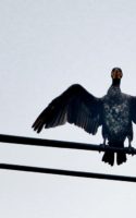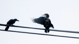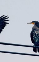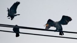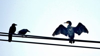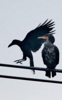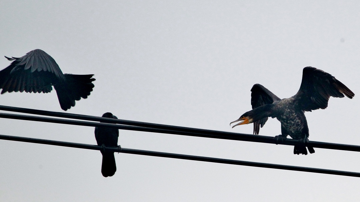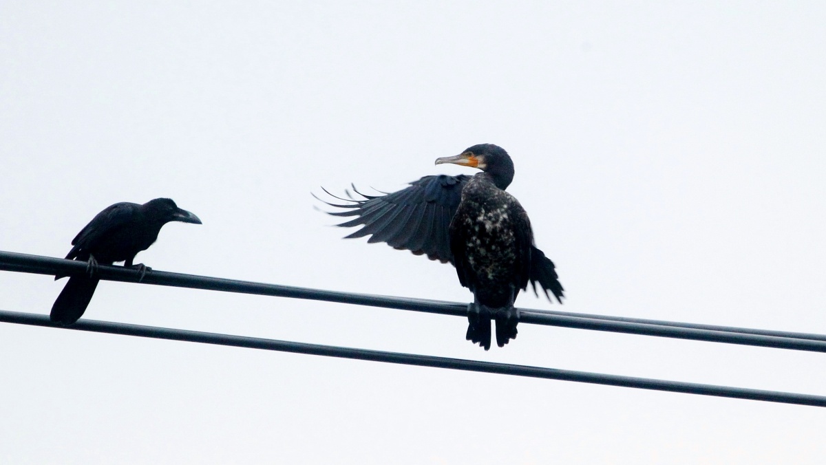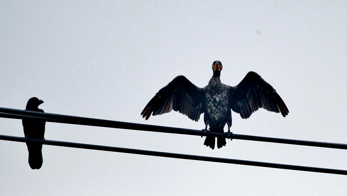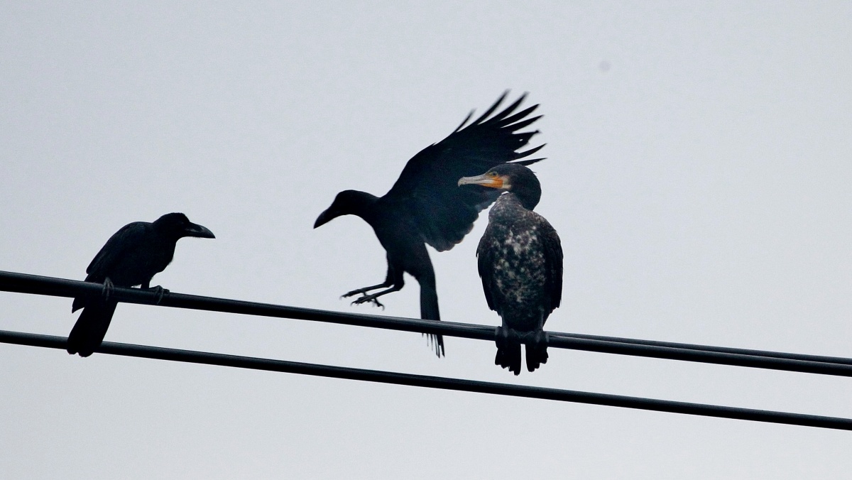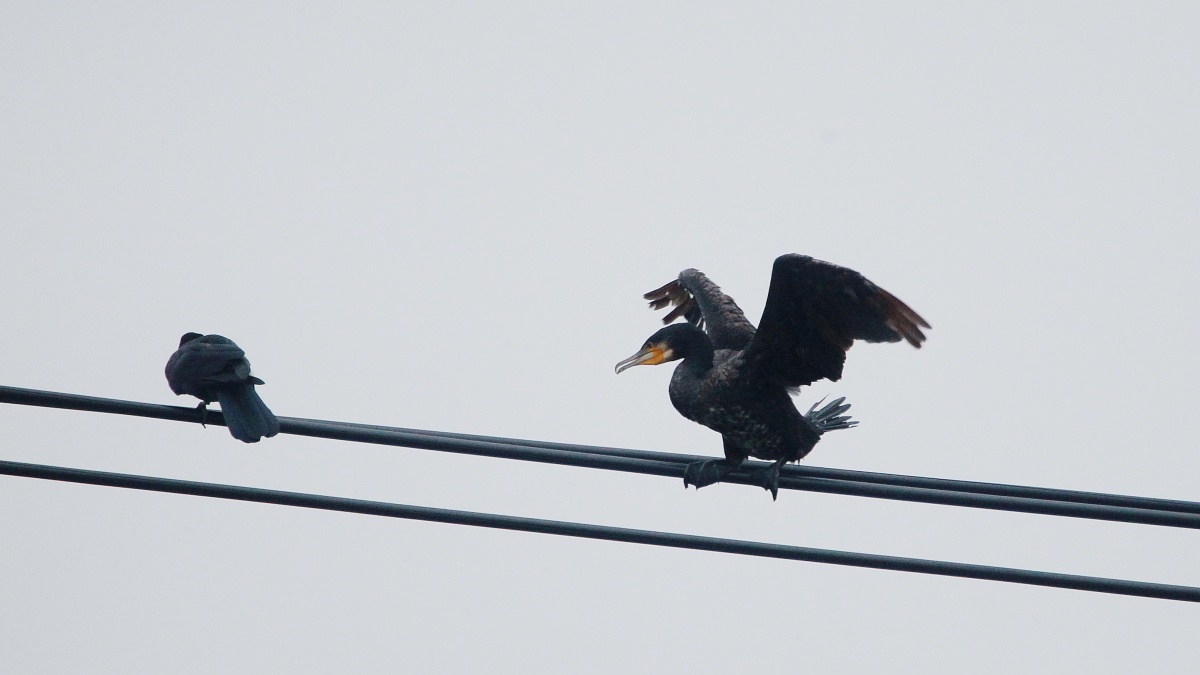 今朝の公園で~最近何時も電線に止まる年寄りの鵜と若いカラスの攻防戦!
