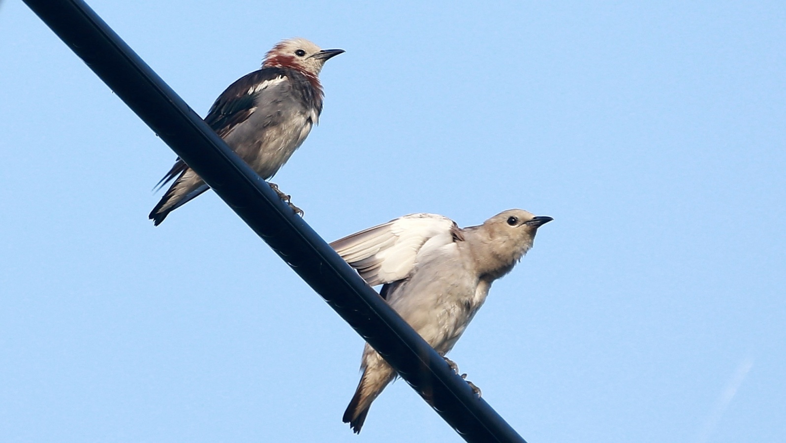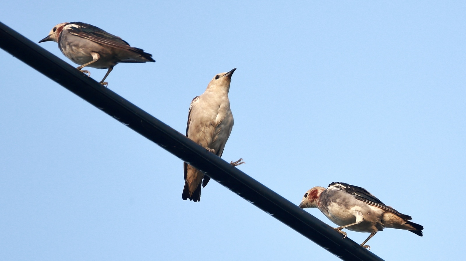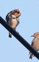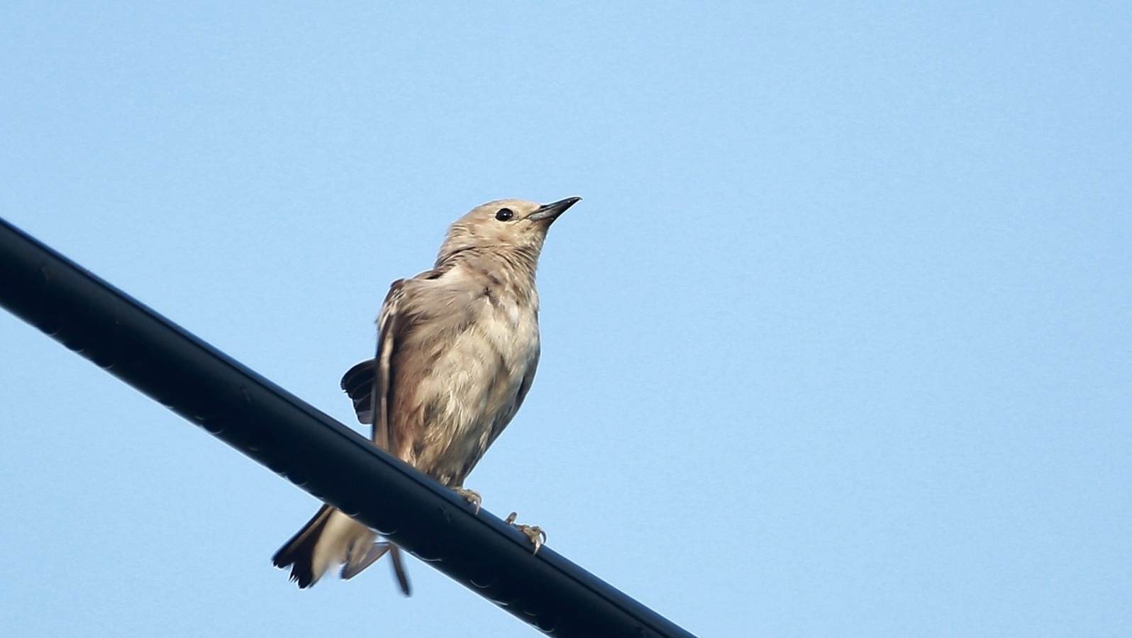 今朝も諦めて車で戻る寸前、電線にムクドリと混ざってコムクドリが……