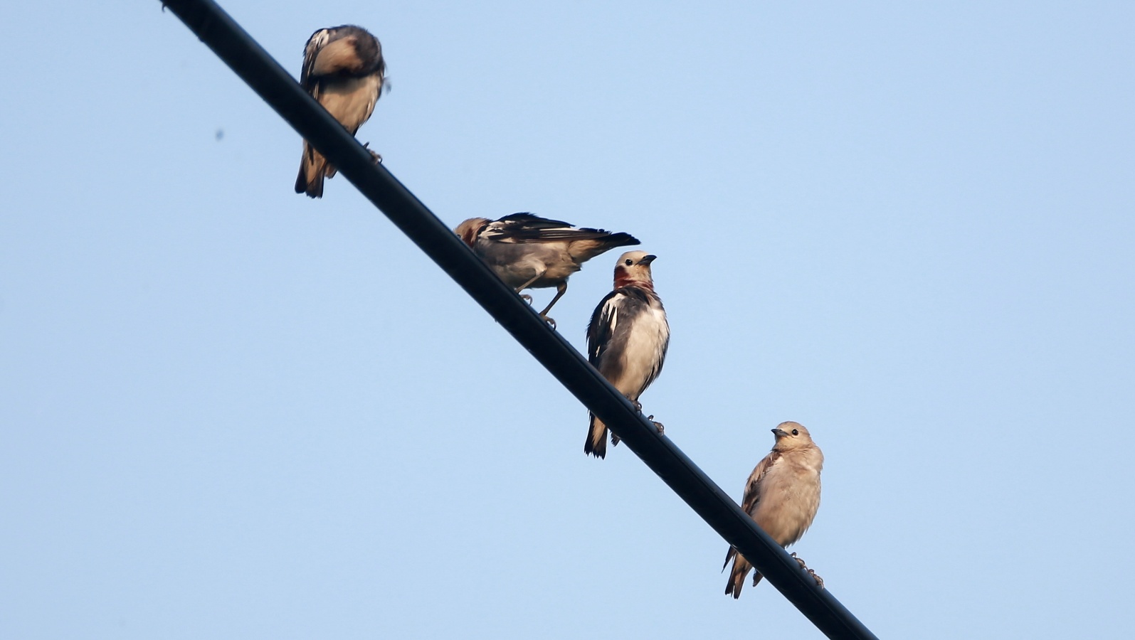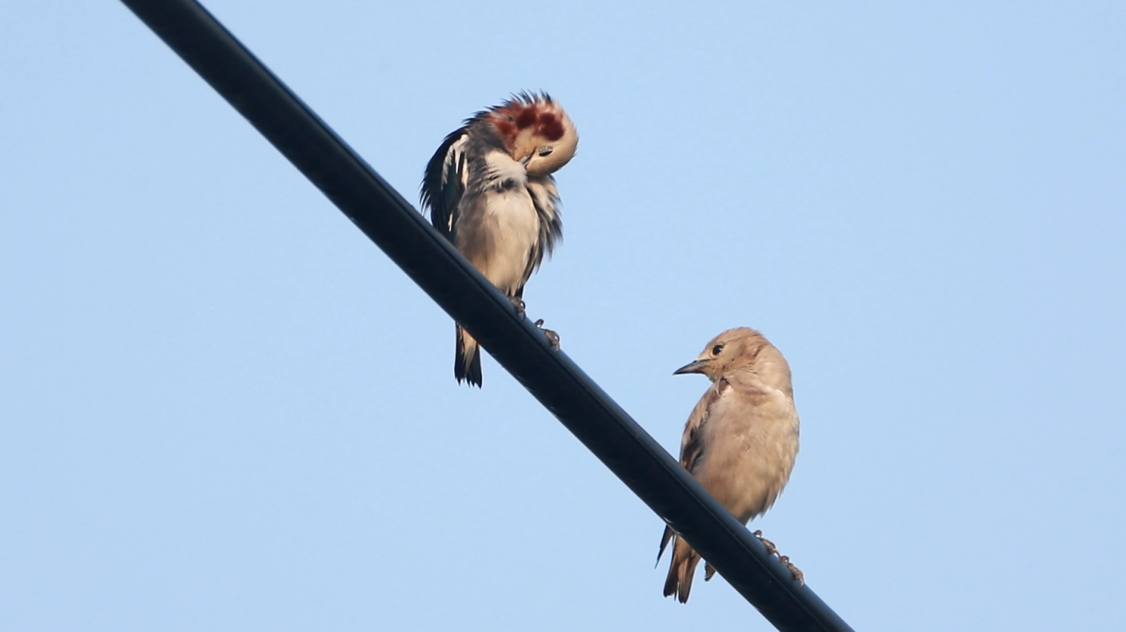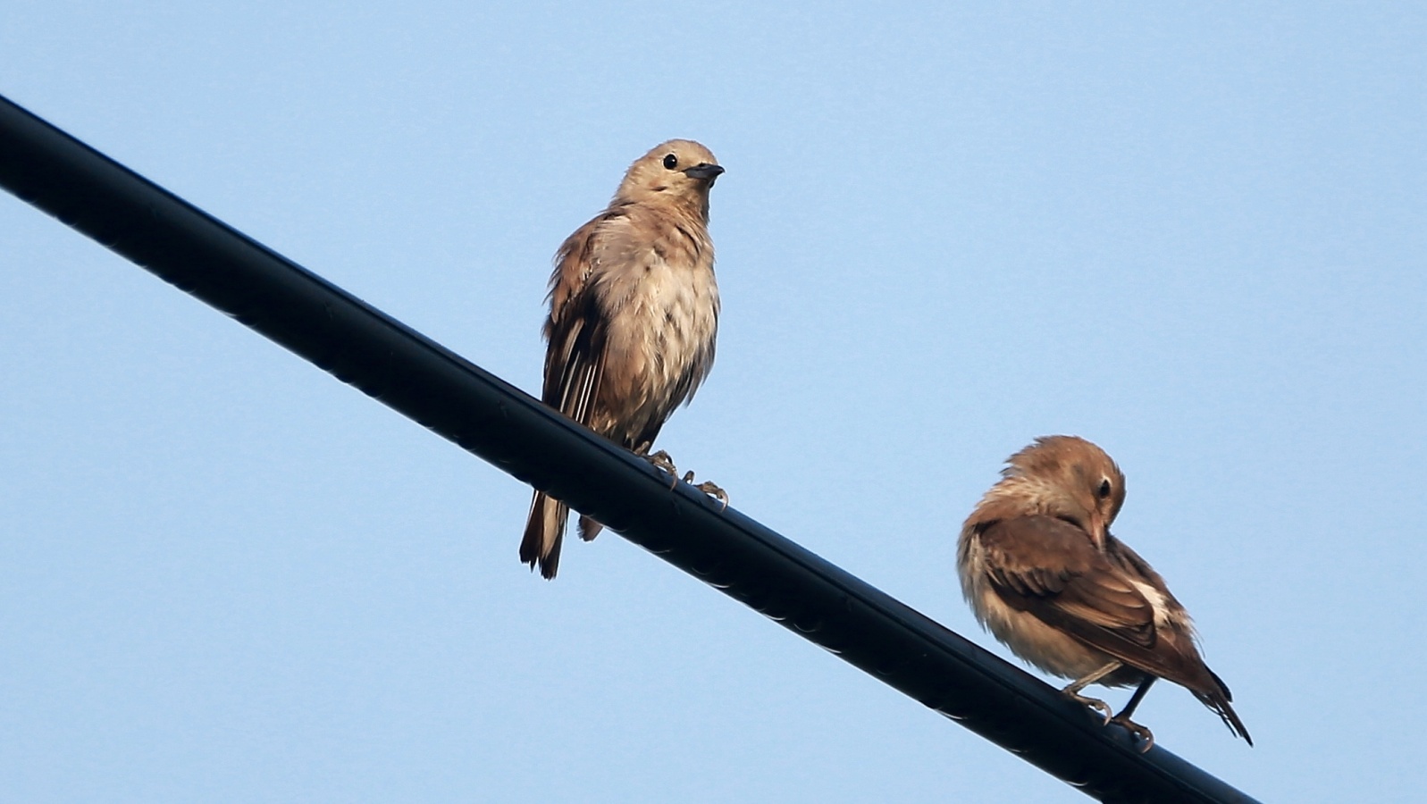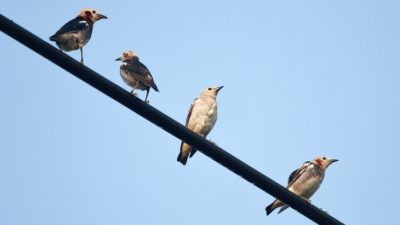 今朝も諦めて車で戻る寸前、電線にムクドリと混ざってコムクドリが……