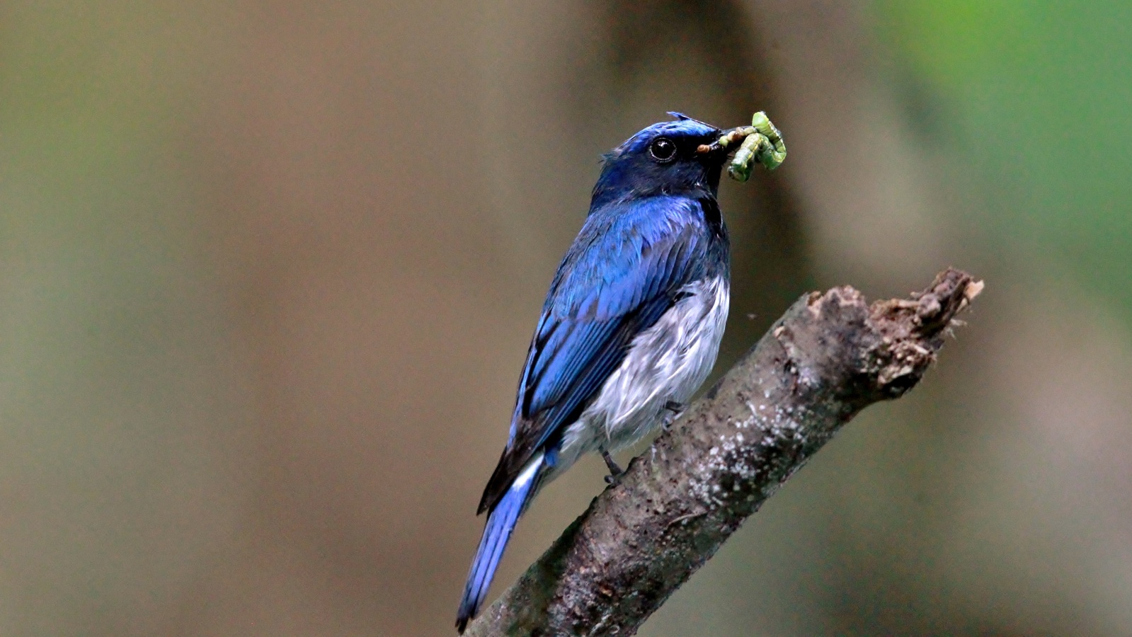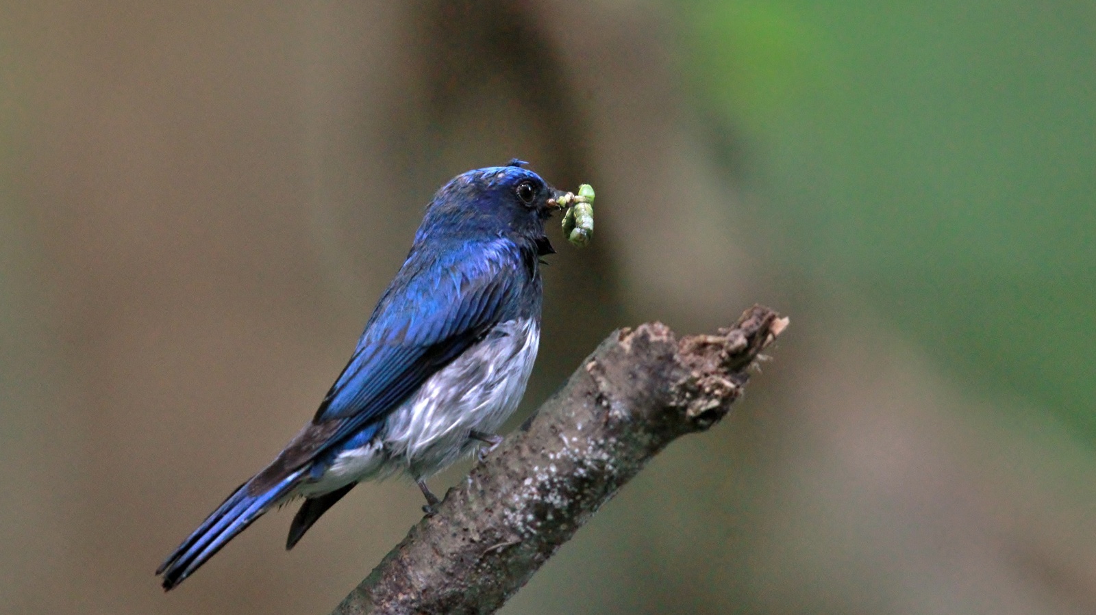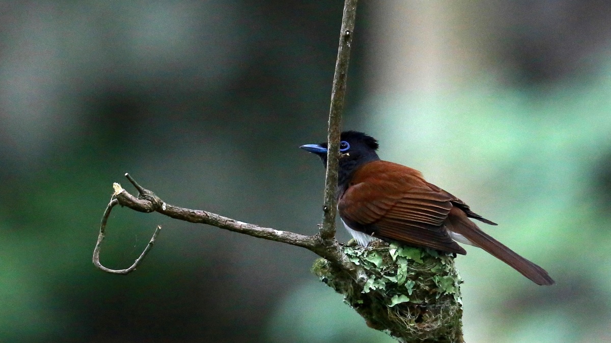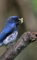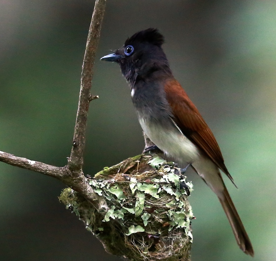 サンコウチョウの続きで~今日は雌(♀)の親鳥ですが、なんだか得体の知れない足の長い昆虫を雛の口に無理やり(笑)押し込んでいる感じもあります。~(爆)
