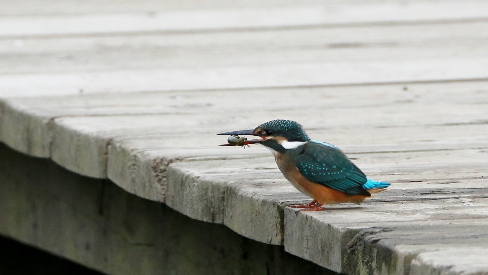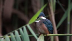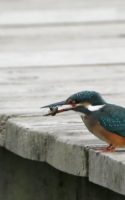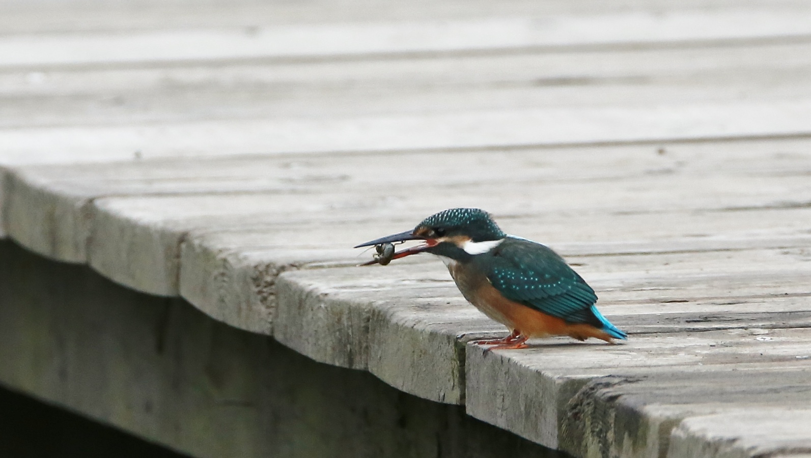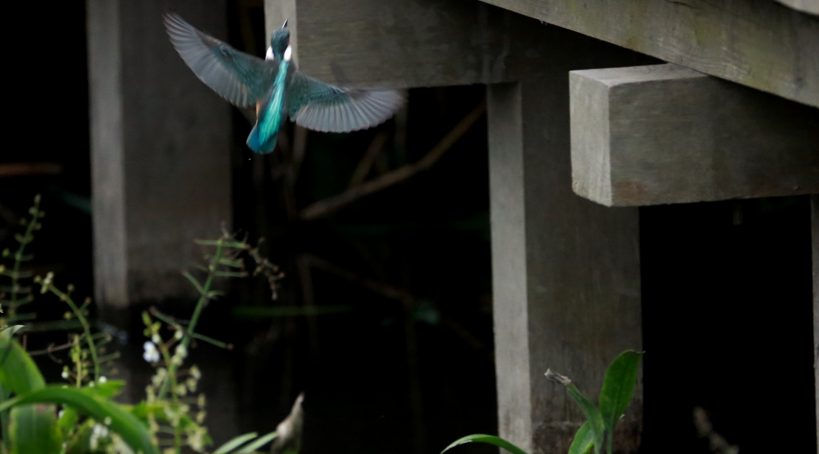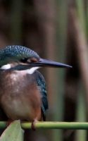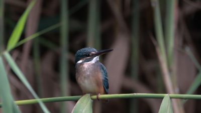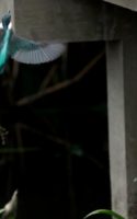 賑やかになる翌日の月曜日には公園の池に中々翡翠も現われてはくれないのですが……今朝は現われました!しかも何時もの固体ではない若い雌(♀)で、少しおっとりした感じの仔です。 餌捕りもまだ下手なで2・3度飛び込みやっとエビを捕らえ……葦の陰に隠れ見えなくなったので見える場所(約7m)まで近づいても全然平気な結構”有望な♀です~♪(笑) 撤退までの制限時間の10分前に現われ最後まで居てくれました!  まだまだ遊んでくれそうなのに明日への期待を残して、後ろ髪を引かれながらの撤退です。~(笑)