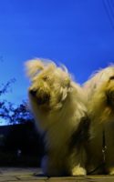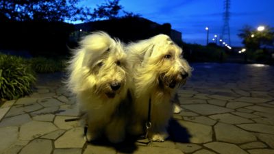 なにしろ風の強かった早朝散歩で……温度は高くて歩いている時は凄く暑く、休憩すると風のせいで寒い!~(笑) 暗いし、コートがなびいてピントがなかなかあいません! 散歩できない雨も困るけど、強風も嫌だなぁ~(爆)