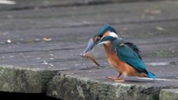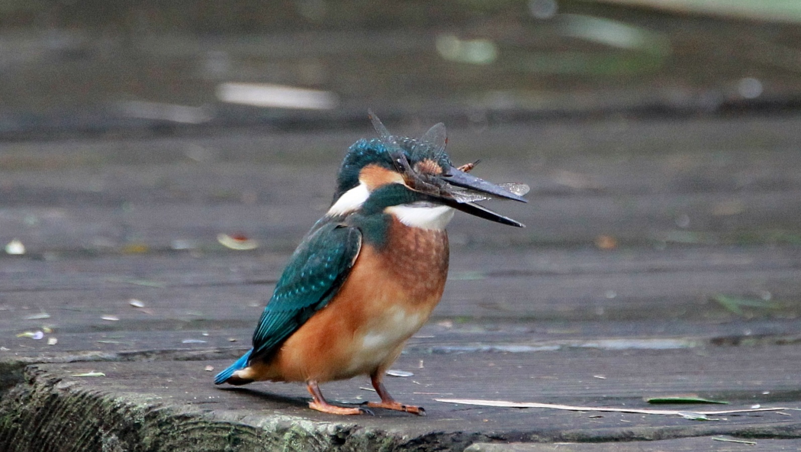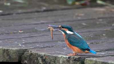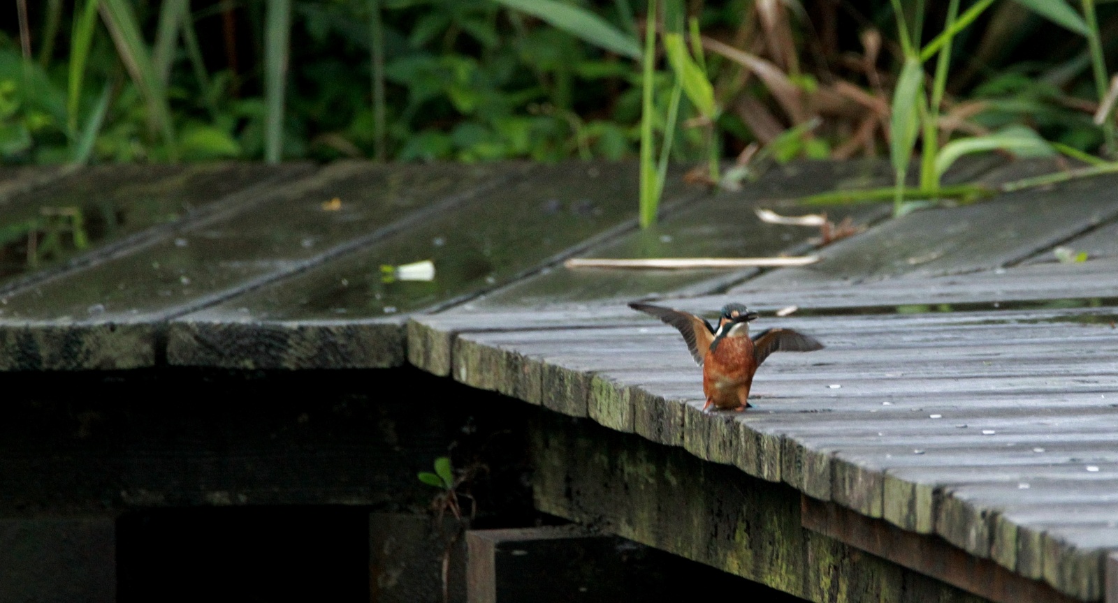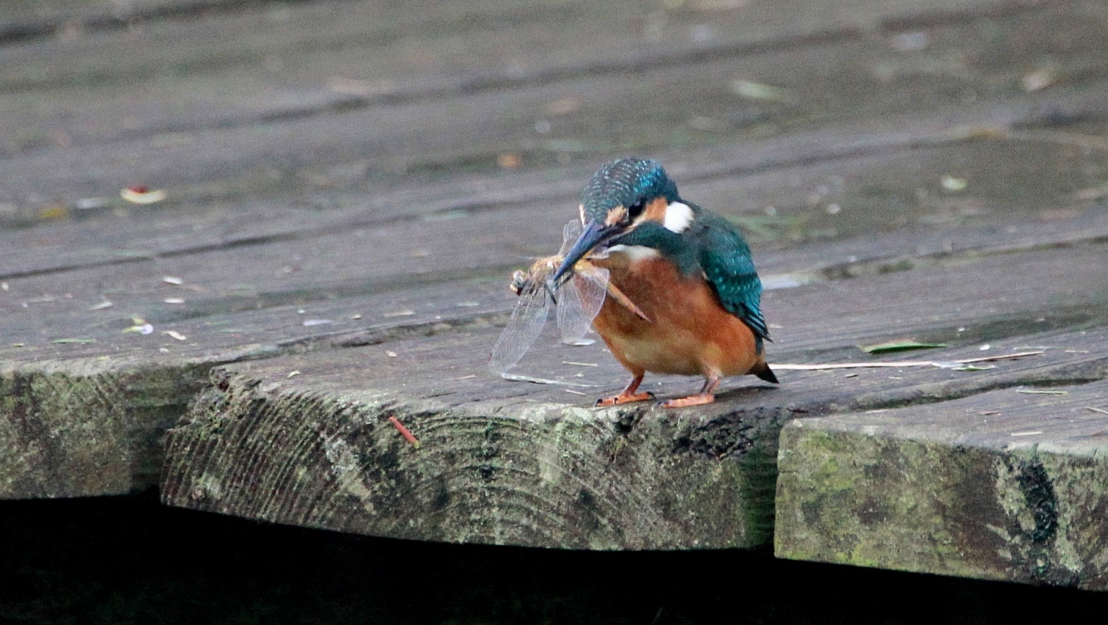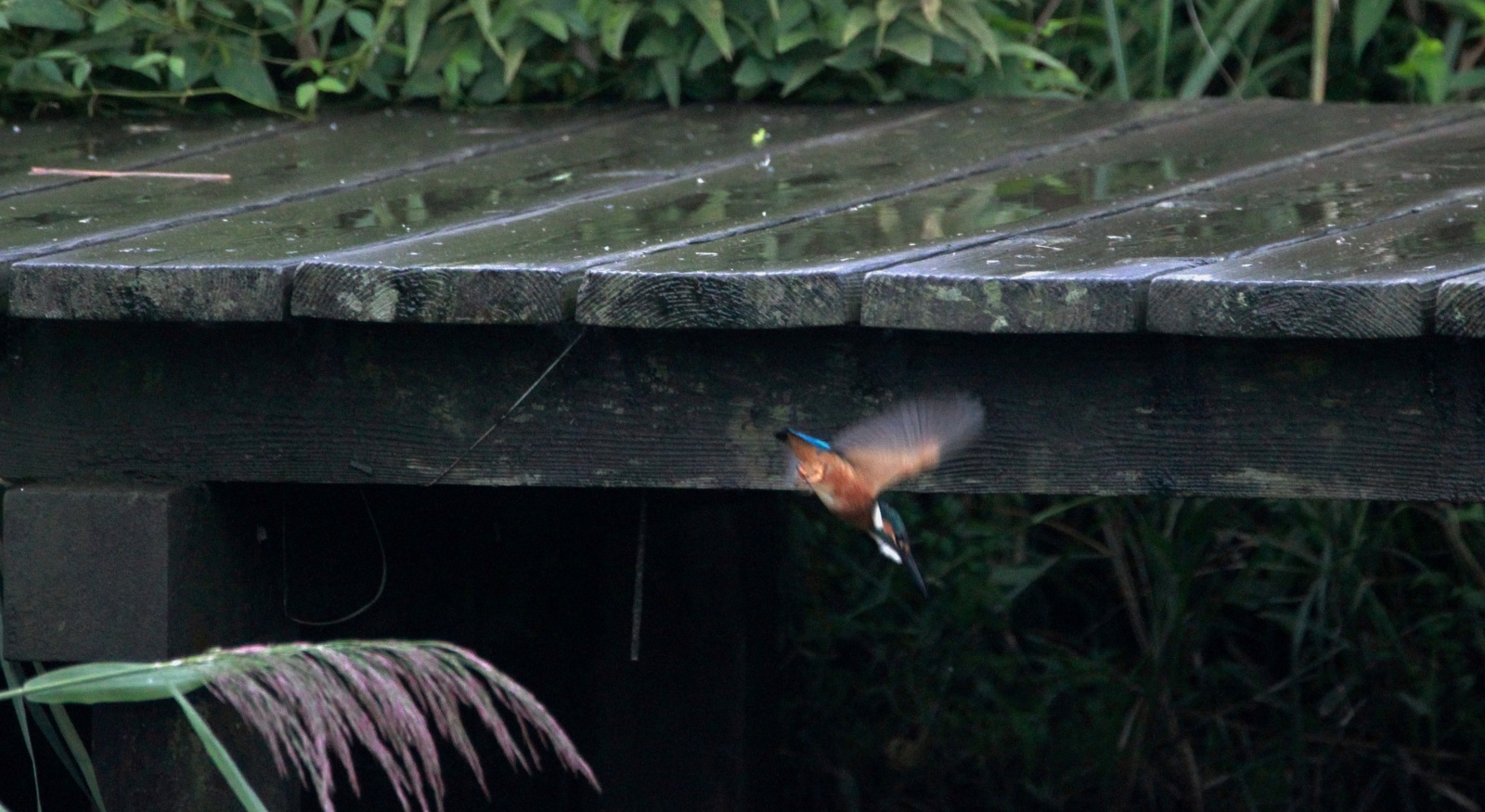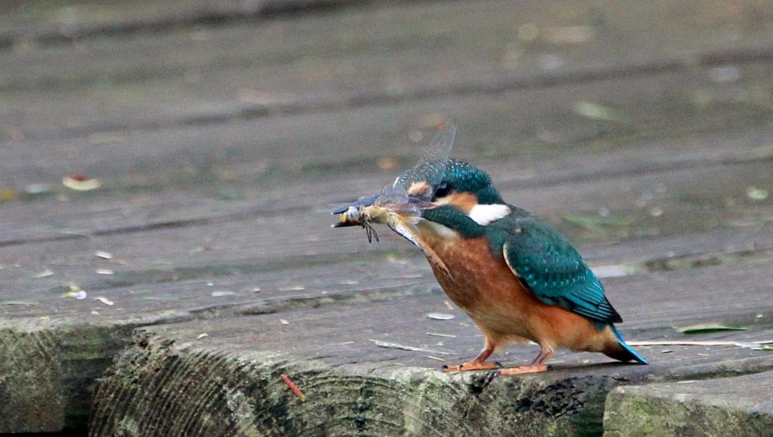 昨晩からの台風の強風が早朝散歩の時にもまだ少し強くて、南に向かって歩くと銜えタバコの火が消えちゃうほどでした。……(駄目だろ!歩きながら!~笑”)  今日は久し振りな早朝鳥撮りに公園の池に行ってみたら珍しく最初から居ました……何時もの翡翠の♀ではなくて、少し年上?の♂の翡翠君です!暗くて飛び込みは全滅!少し明るくなってからやけに上のほうを気にしているな?なんて思っていたら、赤とんぼを捕まえ、チョット苦労しながらもこのトンボを丸吞み!食べてしまいました!   今までトンボを捕まえ多野は何度か見た事は有りますが……トンボ”食べちゃうのなんて見るのは初めてで、びっくりしたオヤジです。